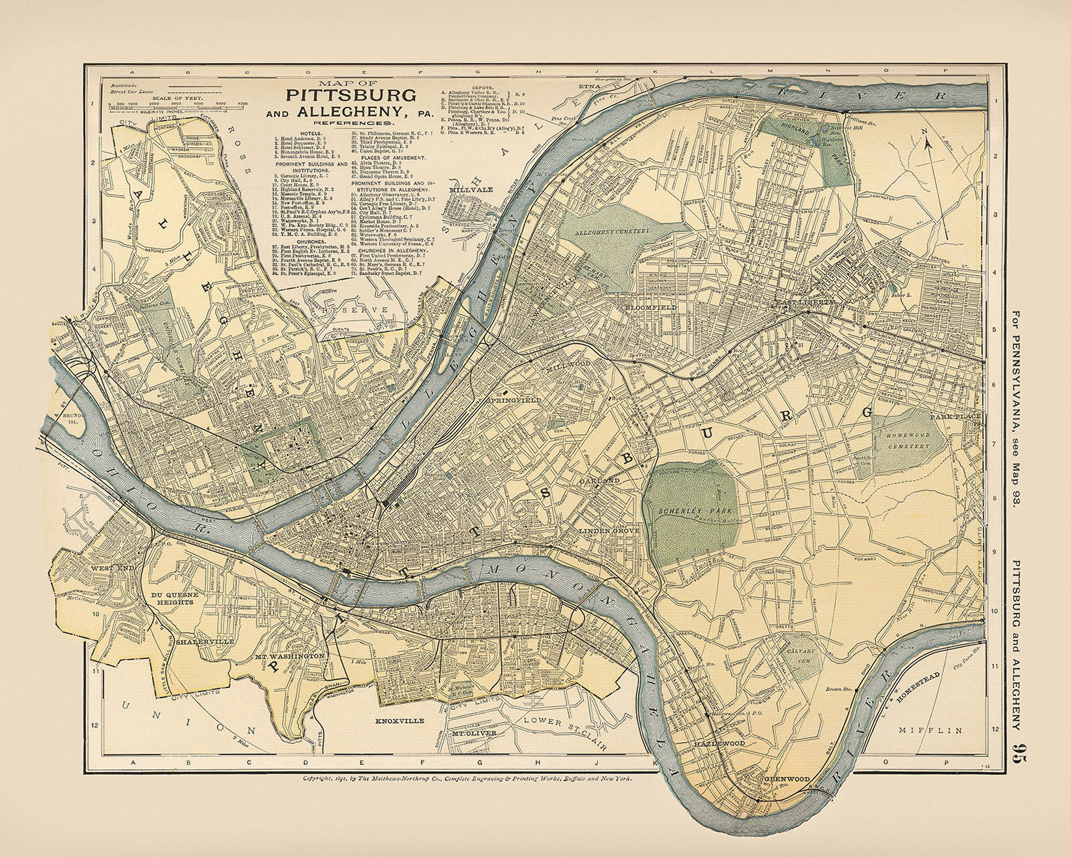 El mapa también sirve como un documento histórico, detallando la infraestructura que impulsó el crecimiento de la ciudad. La intrincada red de ferrocarriles y líneas de tranvías ilustra el papel de Pittsburgh como un nexo de transporte, vital para el movimiento de mercancías y personas durante un período de expansión industrial exponencial. La enumeración detallada de calles, desde la 10th Street hasta la 39th Street, junto con depósitos, hoteles, iglesias y otros puntos de interés, proporciona una visión sin igual de la actividad bulliciosa de la ciudad y su diversidad arquitectónica a principios del siglo.