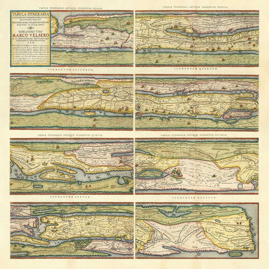 Ortelius creó este mapa a finales del siglo XVI a partir de la Tabla de Peutinger, un manuscrito del siglo XIII que a su vez es una copia de un mapa manuscrito aún más antiguo de la red de carreteras del Imperio Romano, conocido entonces como el "cursus publicus"