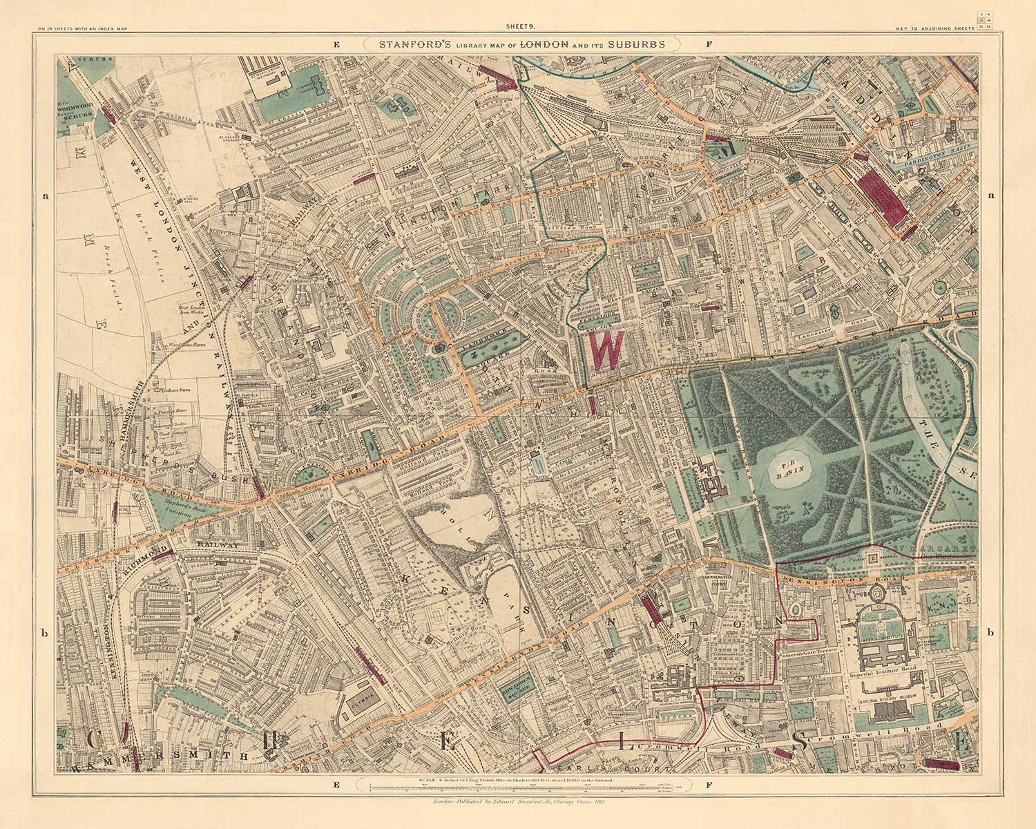 El mapa se publicó originalmente en 24 hojas. En total, el mapa habría medido aproximadamente 2 metros de ancho (78 pulgadas). Este aquí es la hoja 9, que se centra en Notting Hill, Bayswater, Kensington y otras partes del oeste de Londres.