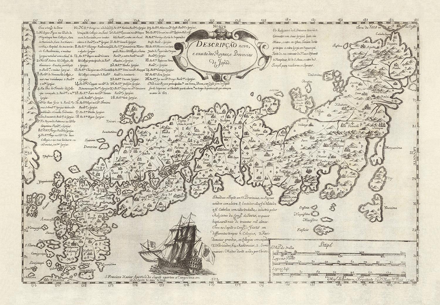 La importancia histórica de este mapa se ve aún más realzada por su conexión con las misiones jesuitas en Japón, particularmente a través de la representación del barco de vela en la parte inferior, simbolizando la llegada de San Francisco Javier a Japón en 1549. Este elemento del mapa destaca las primeras interacciones entre Europa y Japón, lideradas por figuras como Javier y sus compañeros, quienes fueron de los primeros en introducir el cristianismo en Japón. Los orígenes del mapa se remontan al manuscrito perdido de Moreira, derivado de los tradicionales mapas japoneses de estilo "gyoki", que eran conocidos por sus únicas convenciones cartográficas que datan del siglo IX. Esta mezcla de técnicas de mapeo indígenas y europeas convierte a este mapa en un fascinante artefacto de intercambio cultural.