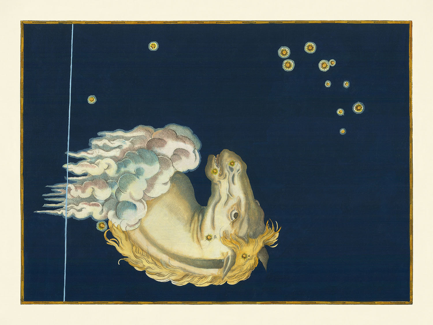 "El Antiguo Mapa Estelar de Equuleus" es un elegante mapa estelar coloreado a mano por Johann Bayer, publicado por primera vez en 1603. Esta impresionante pieza muestra la constelación Equuleus, conocida como el "Caballito" en griego. Equuleus fue una de las 48 constelaciones catalogadas por el renombrado astrónomo del siglo II, Ptolomeo, y todavía se reconoce hoy entre las 88 constelaciones modernas definidas por la Unión Astronómica Internacional.