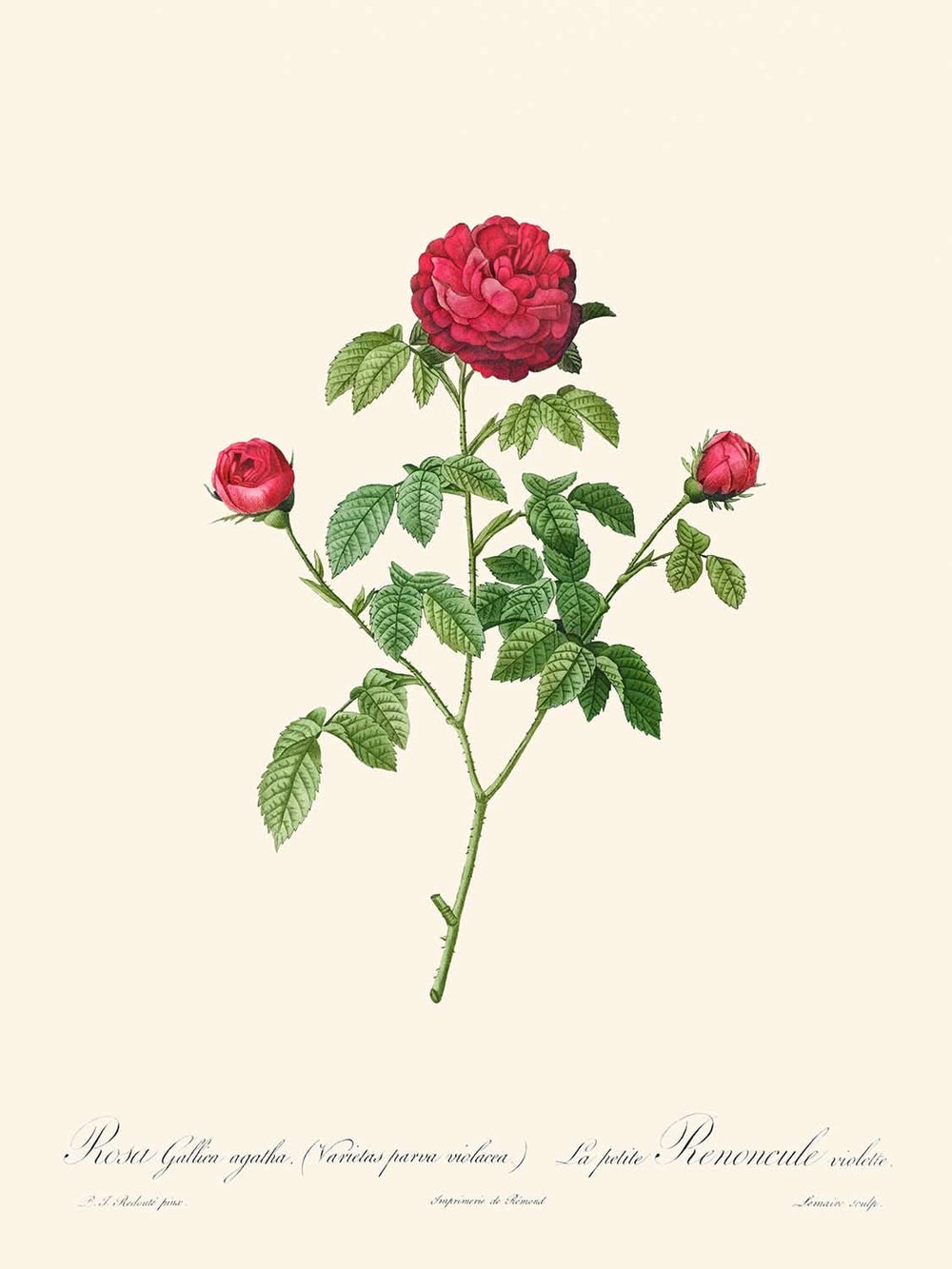 La rosa de Provenza o de Francia, publicada por primera vez en 1817, es una impresionante ilustración botánica del aclamado Pierre-Joseph Redouté. Conocido como uno de los artistas botánicos más influyentes de la era victoriana, Redouté dedicó gran parte de su carrera a capturar la delicada belleza de la flora del castillo de Malmaison por orden de Josefina Bonaparte, la esposa del general Napoleón. Esta obra de arte ejemplifica su profunda habilidad para retratar maravillas botánicas, mostrando la exuberante elegancia y los intrincados detalles de la rosa francesa.