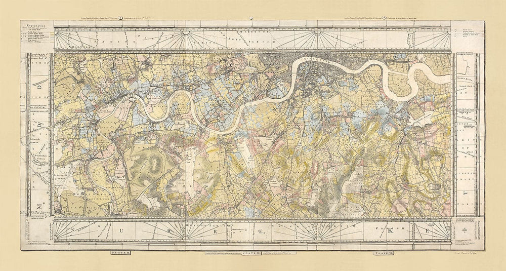 Este es un mapa antiguo altamente decorativo y extremadamente raro de Londres desde 1799 por Thomas Milne. Se presenta aquí en la forma de mano original. Este mapa ha sido restaurado amorosamente por los Maps Co. únicos en su taller de Londres, pero aún se ve deliciosamente antiguo y con carácter.