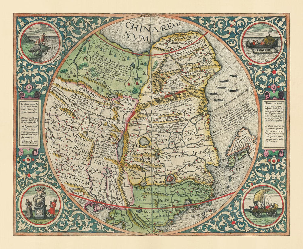 En las cuatro esquinas del mapa hay representaciones de cómo los europeos pensaban que los chinos y japoneses vivían sus vidas. Echa un vistazo a la esquina inferior izquierda, donde un hombre de tres cabezas está siendo adorado por otros dos hombres...