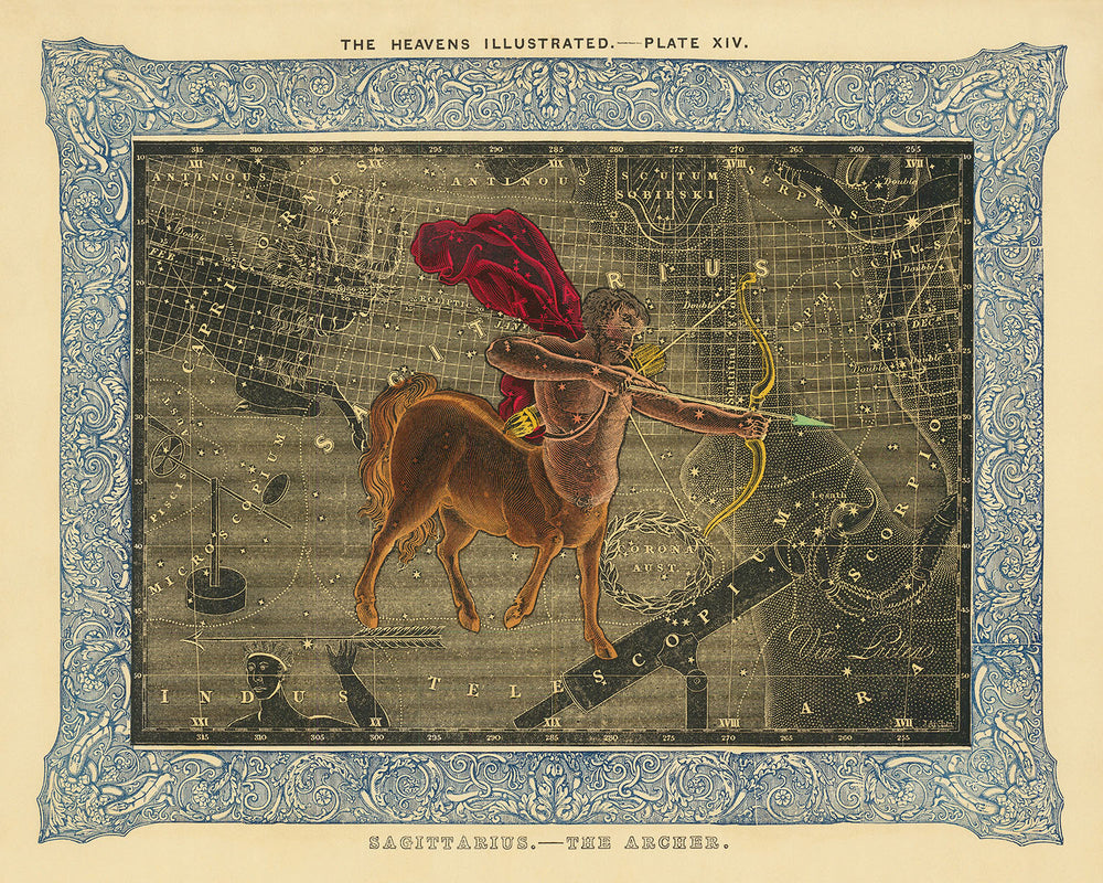 La obra de arte no solo es un reflejo preciso de las estrellas, sino también una ilustración bellamente compuesta con detalles intrincados y ricos matices coloreados a mano. Presentando un centauro arquero apuntando su flecha hacia el corazón de la galaxia, el mapa captura la importancia mitológica e histórica de la constelación. Esta combinación de elegancia artística y precisión científica es un sello distintivo del trabajo de Bradford y una celebración de la cartografía astronómica temprana.