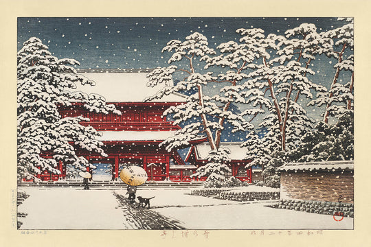 Esta obra en particular es notable por su juego de blanco nieve contra las majestuosas puertas vermellón del templo, todo acentuado por el sereno azul de la sombra y el crepúsculo que cae. La tranquila soledad de la figura solitaria, con un paraguas en la mano, añade profundidad narrativa y resonancia emocional que habla a los espectadores a través de generaciones. La delicada gradación de la suave caída de nieve evoca el suave silencio del invierno, invitando al espectador a entrar en su atmósfera tranquila.