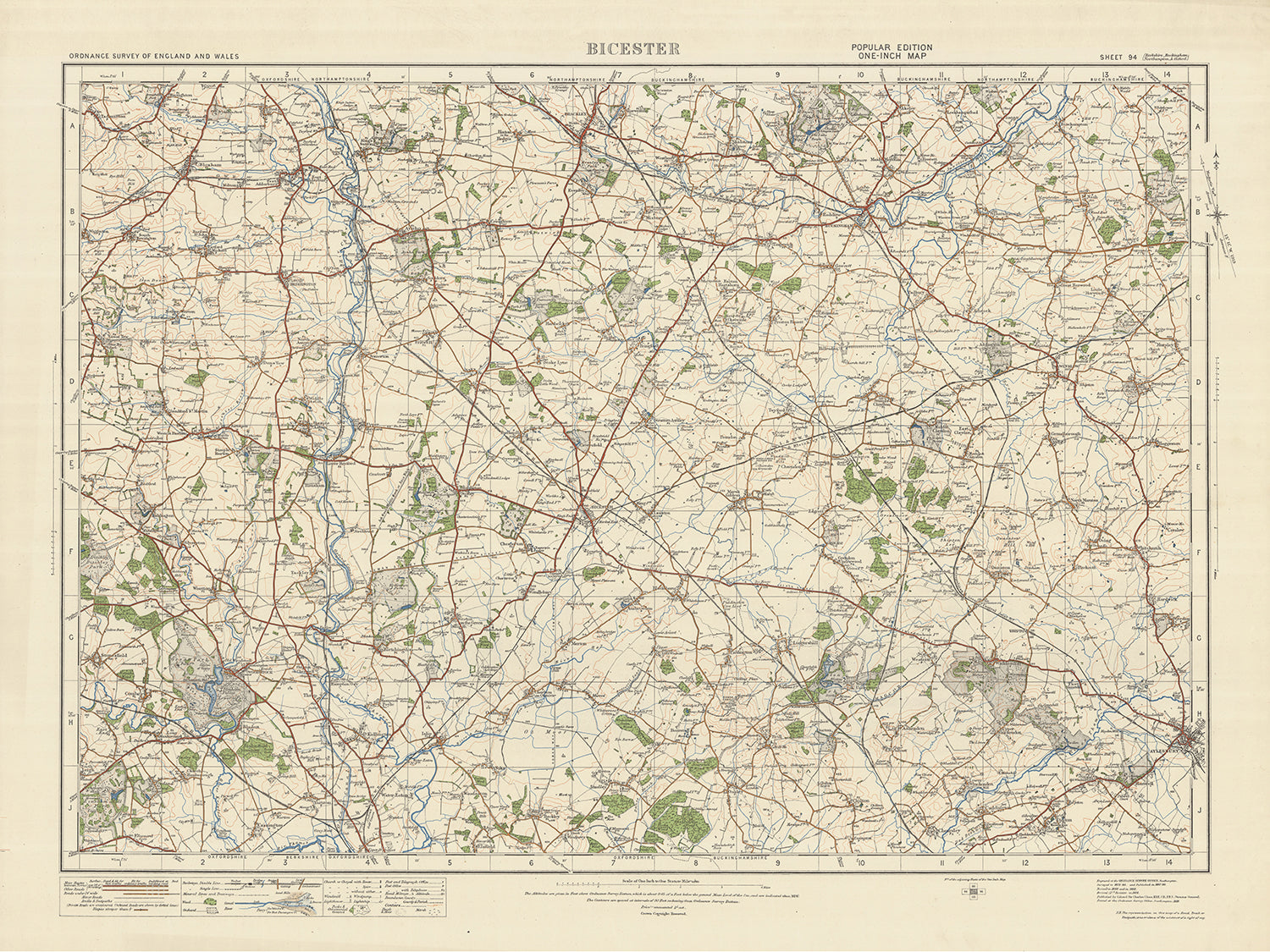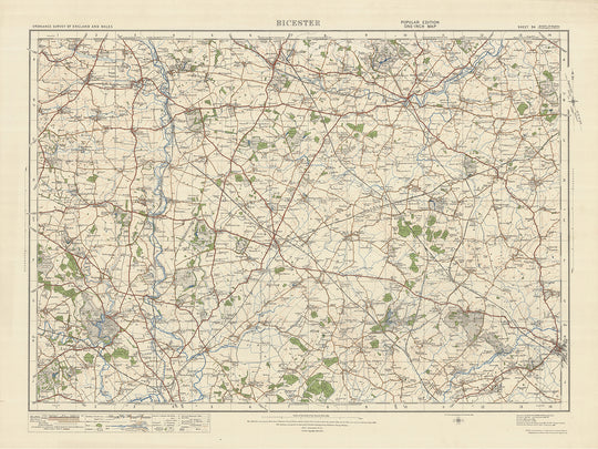 Este antiguo mapa de Ordnance Survey, Hoja 94 - Bicester, de la edición "Popular" de una pulgada de Inglaterra y Gales, publicada en 1925, ofrece una visión fascinante del pasado. El mapa muestra varios pueblos, ciudades y características interesantes, incluidos Buckingham, Brackley, Aylesbury, Kidlington y Woodstock. La histórica ciudad de Bicester, ubicada en el histórico condado de Oxfordshire, ocupa un lugar central en este cautivador mapa.