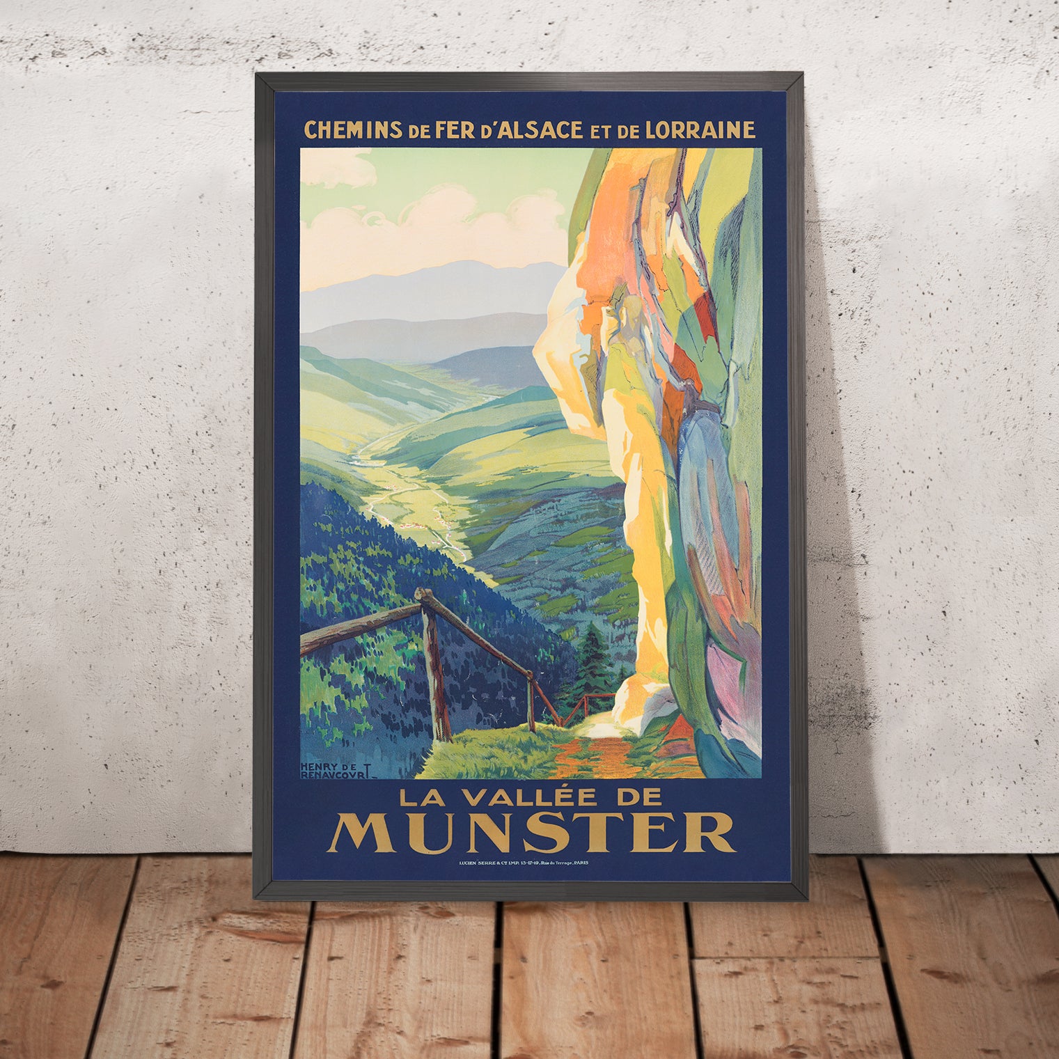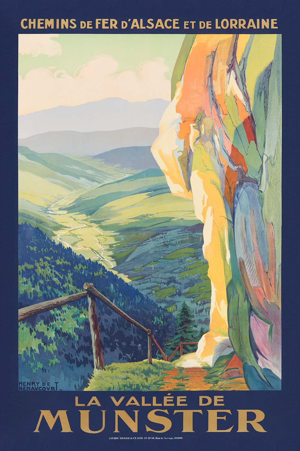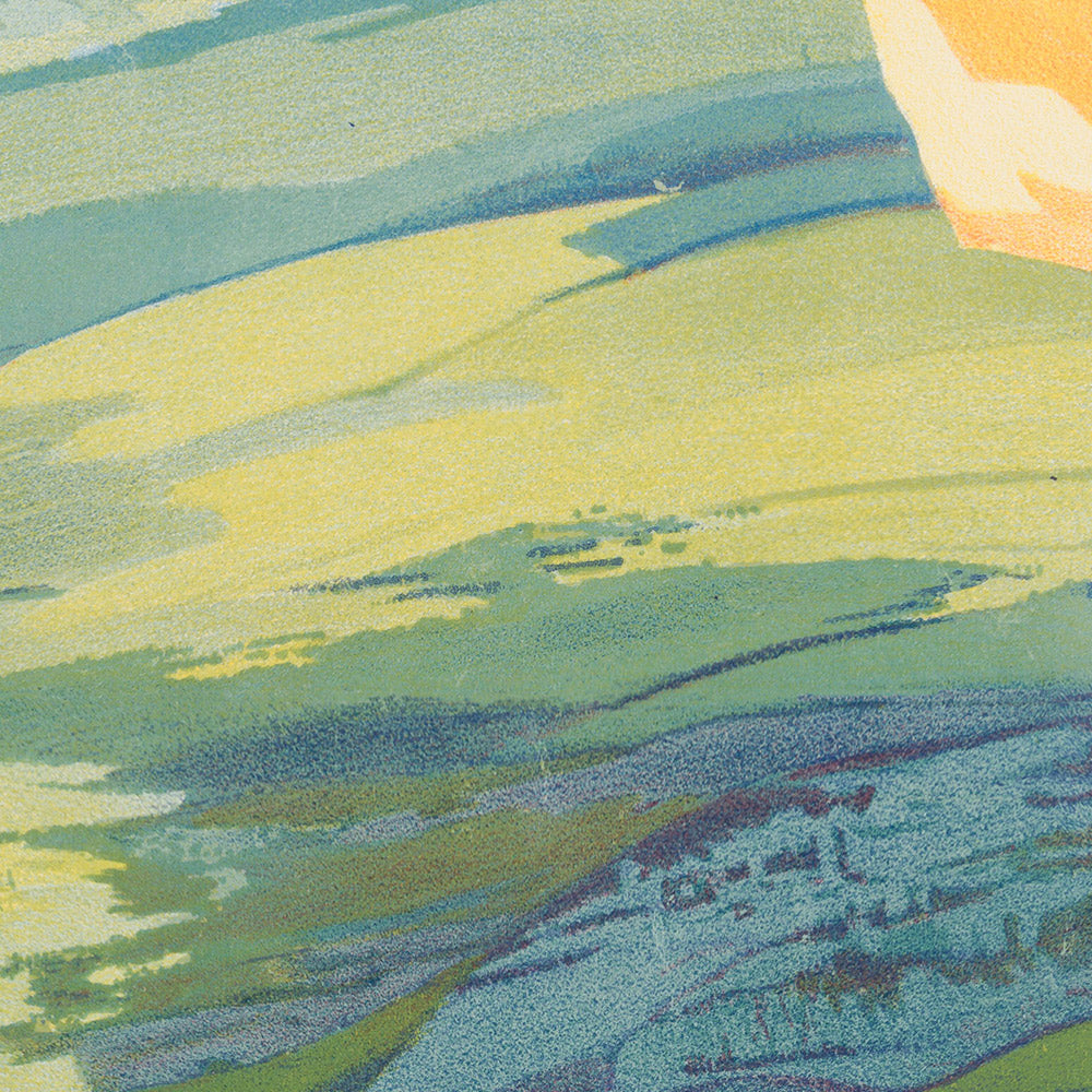 La vallee de Munster by Henri de Renaucourt is a lyrical antique travel poster inviting the viewer into the serene Munster Valley in Alsace, nestled within France’s Vosges Mountains. Rendered in an Art Nouveau spirit, its flowing lines and organic forms celebrate the landscape’s soft slopes and spacious skies, capturing the early-20th-century romance of travel and fresh alpine air. Though little is recorded about Renaucourt today, the poster’s elegant contours, balanced composition, and confident lithographic color speak to a skilled hand steeped in the era’s design language.