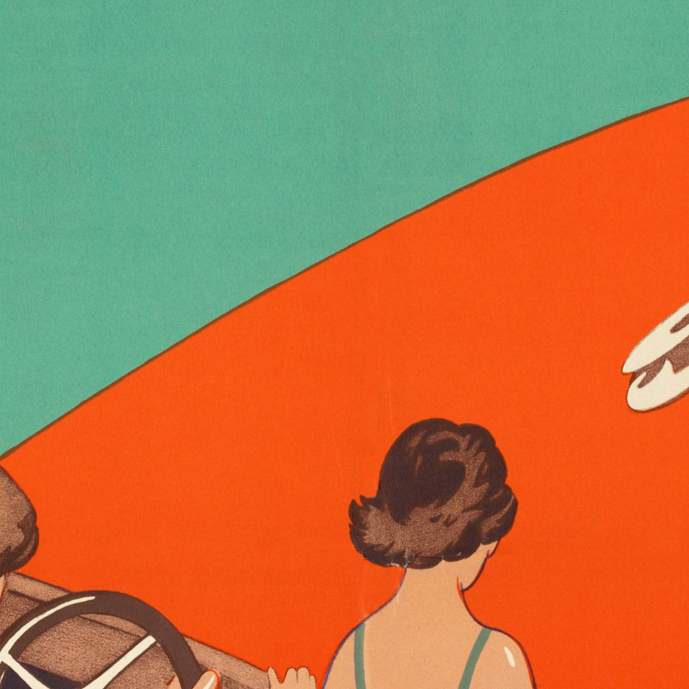 About the artist: Although biographical details of Charles W. Holmes are scarce, his work reflects the best of American Art Deco commercial illustration. Active during the golden age of rail and resort advertising, Holmes favored crisp silhouettes, streamlined compositions, and instantly legible storytelling—qualities that made his posters both persuasive and enduring as design objects. His hand is evident here in the confident outlines, pared-back forms, and aspirational mood that invite viewers to step into the scene.