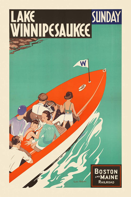 Lake Winnipesaukee Sunday by Charles W. Holmes captures the carefree glamour of a Jazz Age weekend on New Hampshire’s most storied lake. Created as an Art Deco travel poster promoting excursions to the Lakes Region—likely for the Boston and Maine Railroad—it shows a sleek runabout skimming across jewel-toned water, its passengers relaxed and radiant in the summer sun. With bold geometry, elegant lettering, and a buoyant mood, Holmes distills the appeal of a Sunday escape: breeze in the hair, sunlight on the waves, and easy access to nature’s playground.
