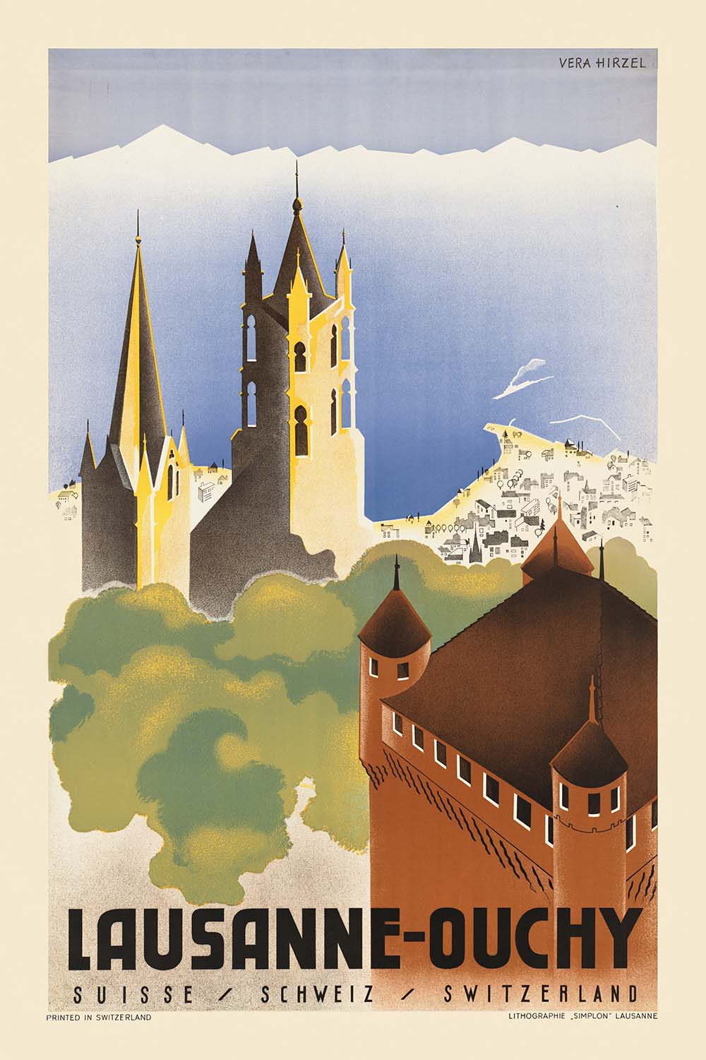 Why this subject matters: Lausanne-Ouchy has long been the city’s window onto the lake—where grand hotels face marinas and promenades, and where travelers connect by rail and steamer to the broader Lake Geneva region. Posters like this were cultural ambassadors, shaping how visitors imagined Switzerland: pristine, cultivated, and serenely modern. Hirzel’s composition encapsulates that ideal, positioning Lausanne as both a restful resort and a gateway to wider adventures.