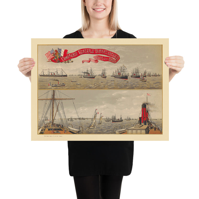 About the design: the palette is refined and nautical—beige and pearl‑grey sky, blue‑grey seas, and accents of vivid red on funnels, lifeboats, and the sweeping title ribbon. Fine black hulls, taut rigging lines, and the CGT house flag atop the mast add crisp graphic punctuation. The two‑tier composition reads like a story: a fleet on the horizon above, then a close‑up of life on deck below, which makes this print both decorative and documentary. It’s a compelling focal point for coastal interiors, studies, and living rooms, and a superb conversation piece for lovers of ocean liners and Parisian history.