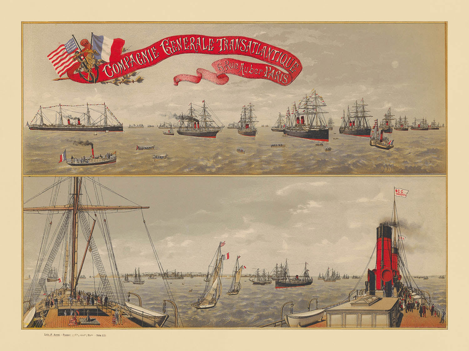 Compagnie Générale Transatlantique, 6, rue Auber Paris by Lith. F. Appel is a handsome Belle Époque travel poster from 1890 celebrating the French Line’s transatlantic service between France and the United States. Across the top, a sweeping red ribbon proclaims the company name and “6 Rue Auber – Paris,” flanked by crossed French and American flags—an elegant nod to the line’s Paris ticket office near the Opéra and its ocean‑spanning routes. The composition is divided into two panoramic scenes: above, a parade of steamships and sailing craft crosses a pearl‑grey horizon; below, a deck‑level vignette places the viewer on board beneath a towering red funnel as passenger tenders and small yachts bustle around the liner. It is a richly nautical snapshot of the age when steam and sail shared the same sea.