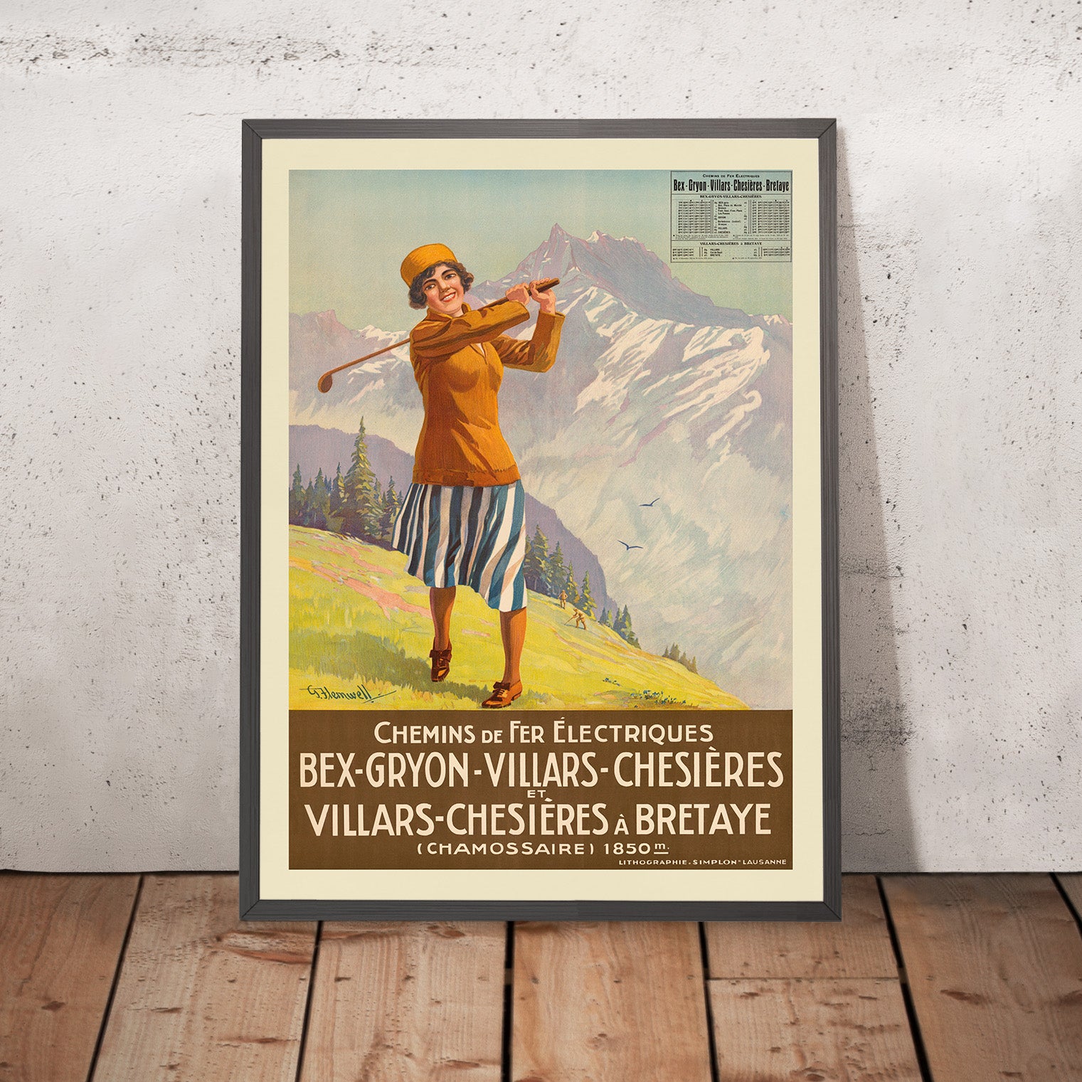 About the subject: The Bex–Gryon–Villars–Chesières lines—and the extension up to Bretaye—were early electric mountain railways that opened up a world of year-round leisure. They linked vineyard towns and hillside villages to high meadows and ski slopes, making Villars a beloved base for winter sports and summer walking. This 1923 design belongs to the golden age of travel posters, when rail electrification and organized tourism transformed how people experienced the Alps—comfortably, efficiently, and in style.