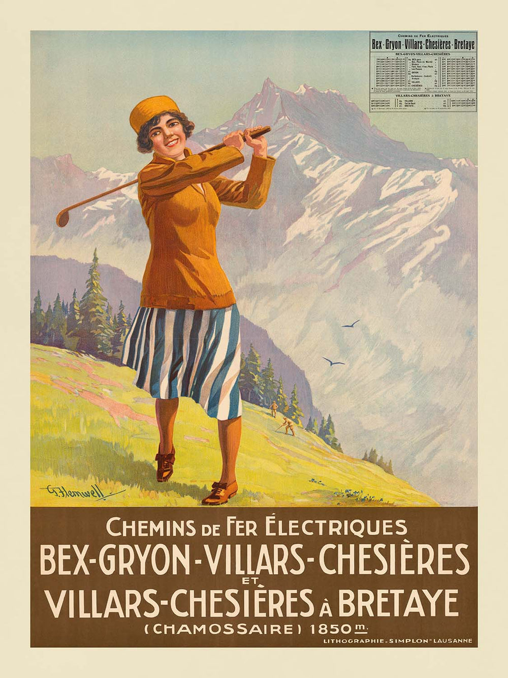 About the artist: George Flemwell was a British-born painter and poster artist who worked extensively in Switzerland in the early 20th century. Renowned for distilled, light-filled Alpine views, he helped define the visual language of European travel advertising between the wars. Flemwell’s posters balanced painterly sensitivity with clear graphic design, translating high mountain light, clean air, and dramatic relief into compelling, modern compositions that beckoned travelers from across the continent.