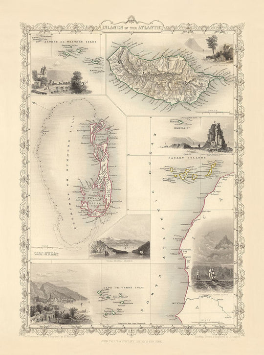 Dispersas por el mapa hay hermosos y detallados grabados de lugares y vistas notables, como una escena de la Isla Faial en los Azores, la playa de Funchal en Madeira, Tenerife con el Monte Teide elevándose entre las nubes, y 'la capilla en la roca' en Cabo Verde.
