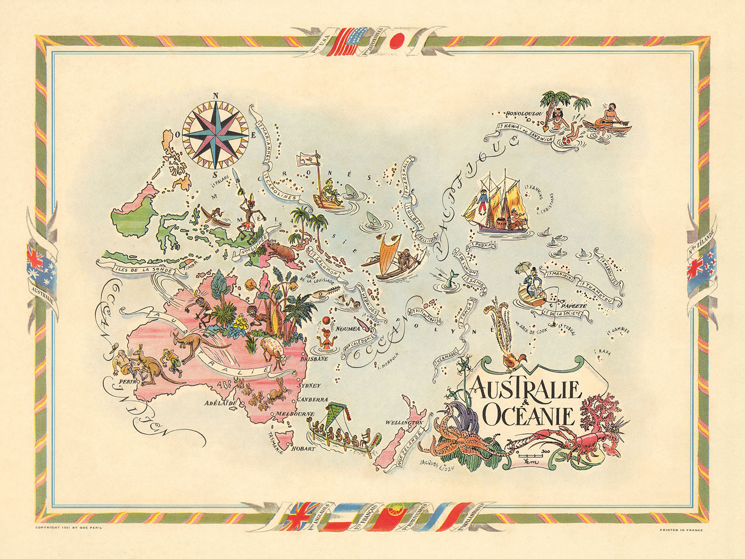 Antigua Mapa Pictórico de Australia y Oceanía por Liozu, 1951: Nueva Zelanda, Fiyi, Papúa Nueva Guinea, Hawái, Islas del Pacífico
