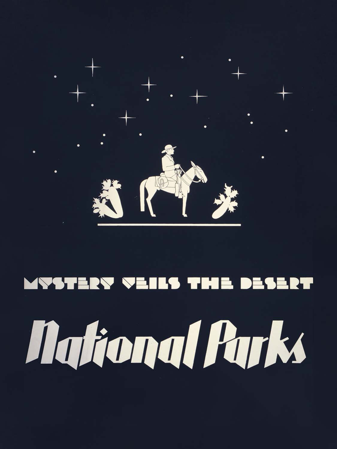 “Mystery veils the desert – National parks” by Dorothy Waugh (1930) invites viewers into the star-studded hush of the American Southwest. Created in the heyday of the Art Deco travel poster, this compelling design emerged as national parks marketing gained momentum, encouraging Americans to explore their own backyard during the challenging years around the Great Depression. Waugh’s composition—cowboy and horse silhouetted against a night sky with sentinel cacti—captures both the romance of the frontier and the promise of discovery that these landscapes hold.