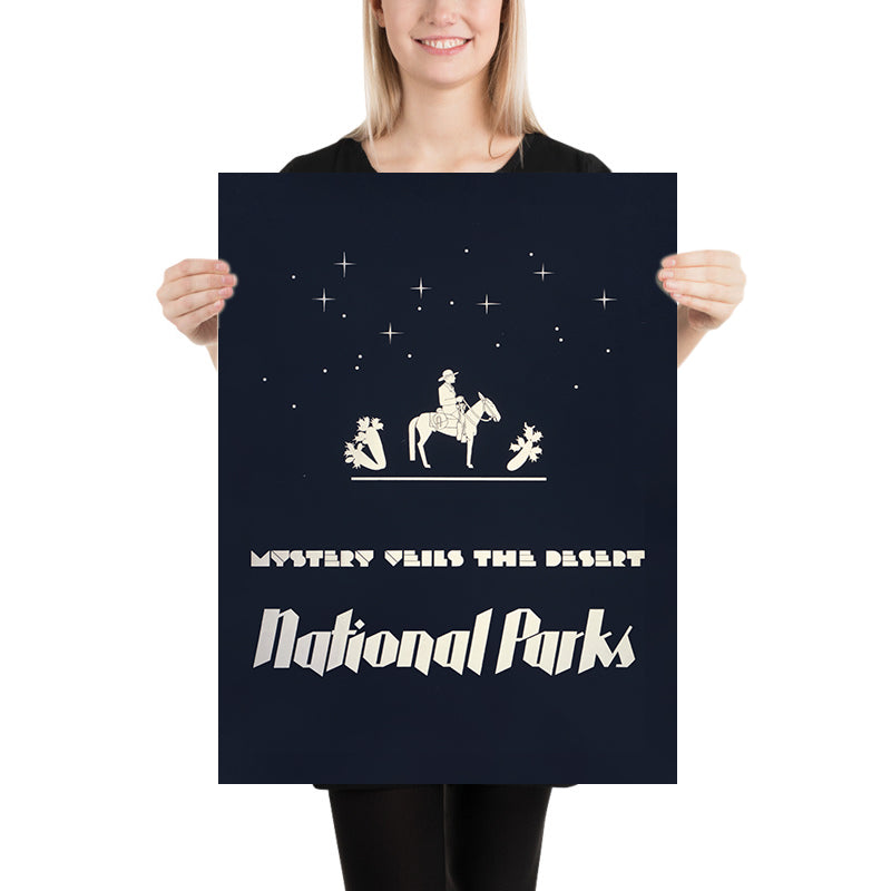 This particular poster is notable for how it distills the desert’s allure into a few unforgettable symbols. The cowboy on horseback embodies the spirit of exploration, while the phrase “Mystery Veils the Desert” casts the Southwest’s parks—think wide-open canyons, cactus gardens, and night skies dense with constellations—as places of wonder. It’s an image that spoke to 1930s travelers hungry for adventure and continues to resonate with hikers, road-trippers, and stargazers who’ve fallen for the desert’s quiet drama.