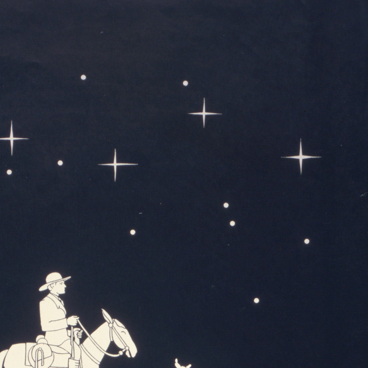 Visually, Waugh’s design is a masterclass in minimal means and maximum impact. A deep navy field anchors the composition, while white figures, typography, and stars strike a clean, modern contrast. The angular Art Deco lettering, simplified cacti, and purposeful silhouettes create a bold figure-ground relationship that reads instantly from across a room. The palette, dominated by blue and white, is versatile for interiors—equally striking above a mid-century credenza, beside natural wood, or in a crisp, contemporary gallery wall—making this a timeless piece to own.