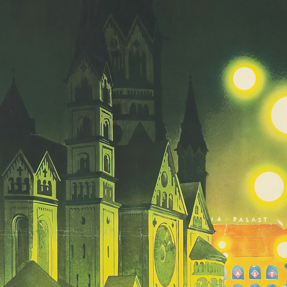 Style and color: Wiertz builds the scene out of deep greens and blacks, punctuated by yellow light and accents of hot pink and electric blue on the neon tower. Notice how the rain‑slicked street becomes a mirror, pulling reflections of taxis and lamps into vertical streaks—a cinematic effect that gives the composition its rush and depth. The tall, elegant “DEUTSCHLAND” lettering and the cathedral’s shadowed mass anchor the modern bustle with timeless gravitas. This balance of history and nightlife makes the piece a standout for lovers of Berlin and classic Art Deco graphics.