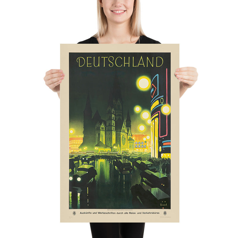 “Deutschland” by Jupp Wiertz (1927) is a luminous celebration of Weimar‑era Germany—specifically Berlin at night. The poster’s subtitle, which appears on the print itself, reads “Berlin bei Nacht (An der Kaiser‑Wilhelm‑Gedächtniskirche),” placing us on the bustling boulevard by the Kaiser Wilhelm Memorial Church. Headlights and streetlamps flare into glowing orbs, neon signage arcs up a modernist corner building, and the church’s dark spire rises like a silhouette against a green‑black sky. The result is both romantic and electrifying: a snapshot of a metropolis in motion.