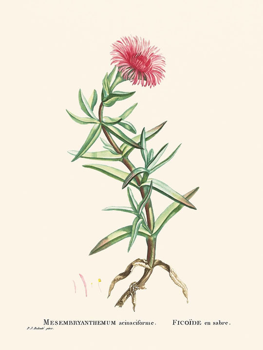 "Mesembryanthemum Acinaciforme" se destaca por su exquisita presentación de las exuberantes texturas y formas de la planta. Los intrincados detalles de la obra de arte y las sutilezas en el sombreado revelan la profunda comprensión que Redouté tiene de su tema, lo que la convierte en una adición vital a cualquier colección de arte botánico.