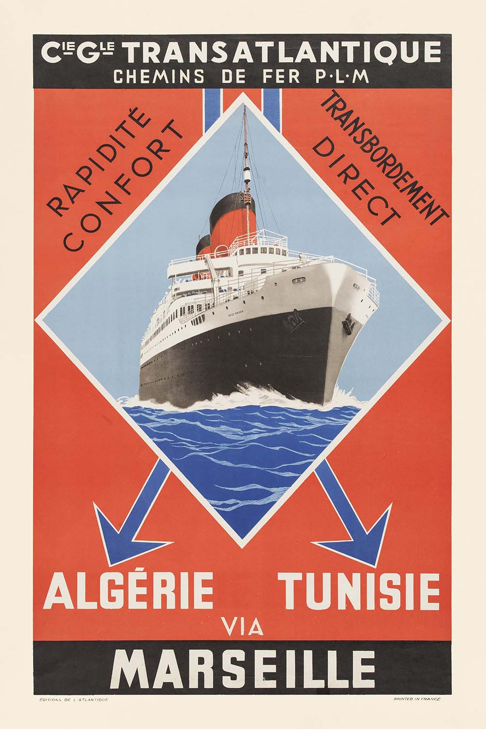 About the makers: the French Line (Compagnie Générale Transatlantique) was France’s storied steamship company—famed for its elegant liners and impeccable service—while PLM (Paris–Lyon–Méditerranée) was the railway that connected Paris with the southeast and the Mediterranean. Together they cultivated a sophisticated visual identity through posters like this one, commissioning talented designers to symbolize modern travel with bold geometry, streamlined forms, and impeccable typography. Even when the artist’s name is lost to history, the house style is unmistakably French and impeccably Art Deco.
