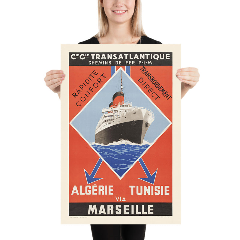Compagnie Générale Transatlantique & Chemins de fer PLM: Rapidité, confort, transbordement direct (1930) is a glamorous Art Deco travel poster from the golden age of ocean liners and express trains. Created by an anonymous poster artist working for the French Line (Compagnie Générale Transatlantique) and the Paris–Lyon–Méditerranée railway, it promotes the effortless “transbordement direct” (direct transfer) between ship and rail. Issued at the cusp of the 1930s, it speaks to a moment when France’s great ports and rail hubs were seamlessly linked, inviting travelers to experience speed, comfort, and modern elegance on journeys to and from the French coast.