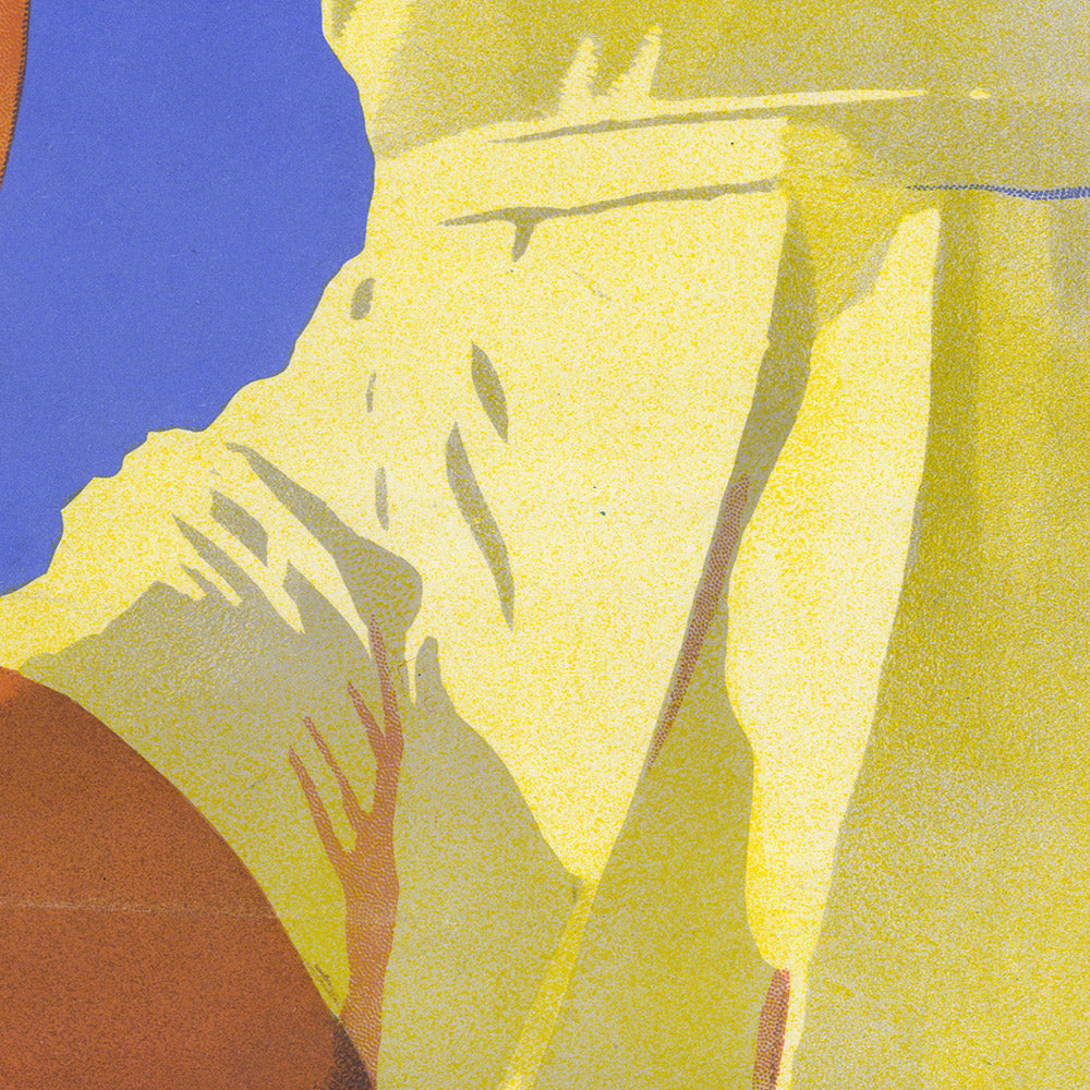 For a Different Holiday, Great Barrier Reef by Percy Trompf (1939) celebrates Queensland’s luminous coral coast at the height of Australia’s golden age of travel posters. Commissioned for the Queensland Government Tourist Bureau, Trompf’s design captures the breezy optimism of pre-war leisure: a smiling holidaymaker in a lemon-yellow playsuit perches on a leaning palm, looking toward a cobalt sky while the shallows below glint with coral-studded sand and tiny star-like motifs. Across the foot of the image, the rallying line “For a Different Holiday” anchors the scene and invites adventure on the world’s most famous reef.