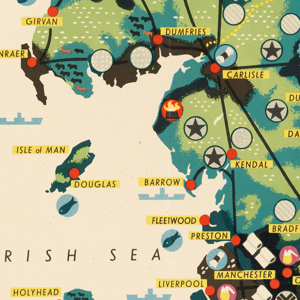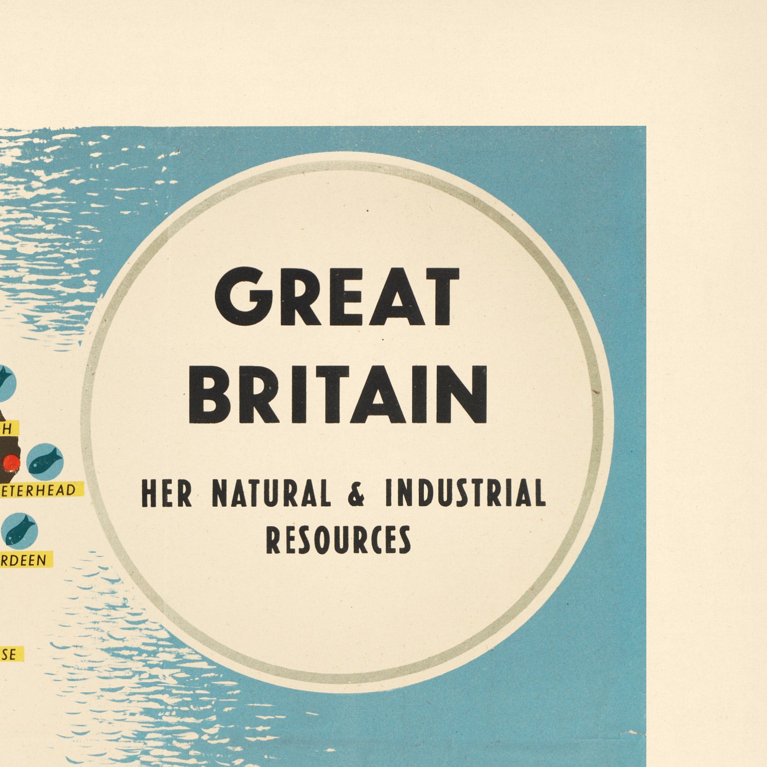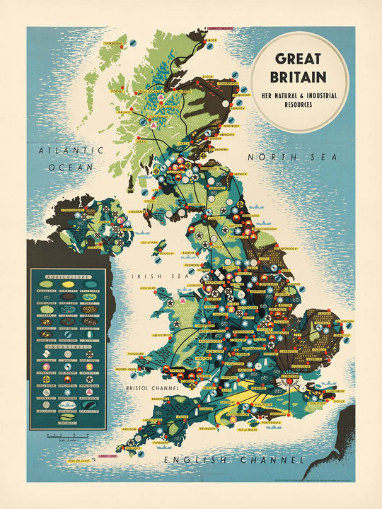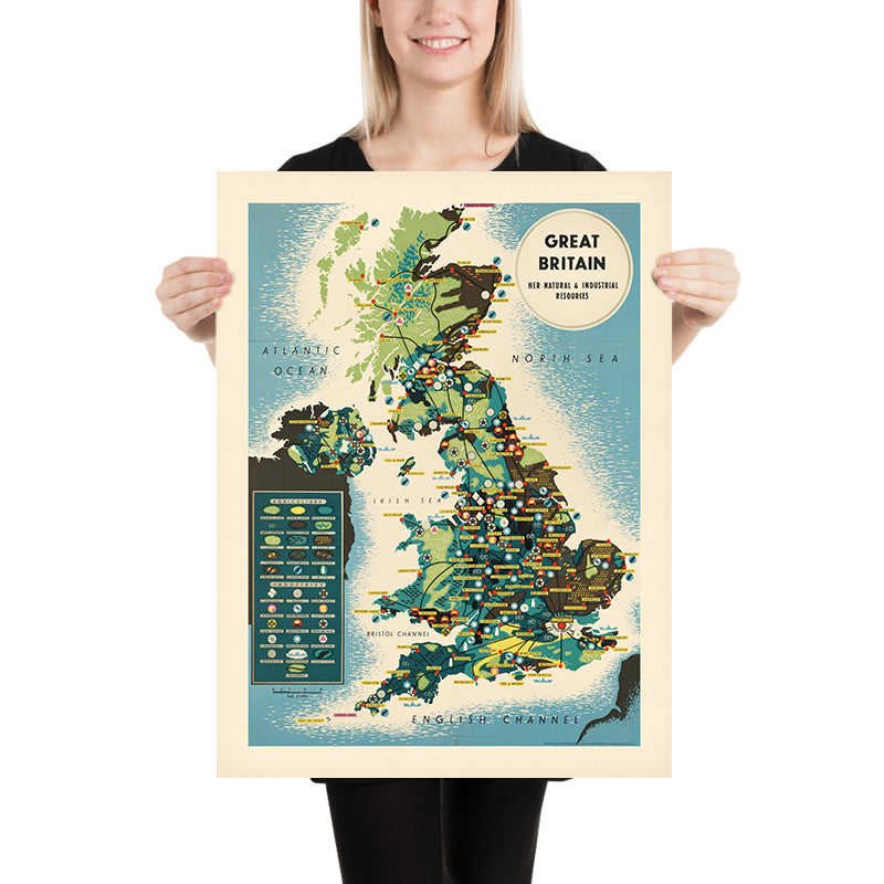 Great Britain. Her natural and industrial resources is a striking mid‑century educational travel poster created by an unknown cartographer working in Britain’s post‑war era. Designed to make complex geography instantly readable, it translates the nation’s landscapes and industries into a colourful language of symbols and textures. Produced when economic recovery and national planning were front of mind, it invites viewers to survey the coalfields, shipyards, agricultural belts, and fishing grounds that shaped modern Britain—all at a glance.