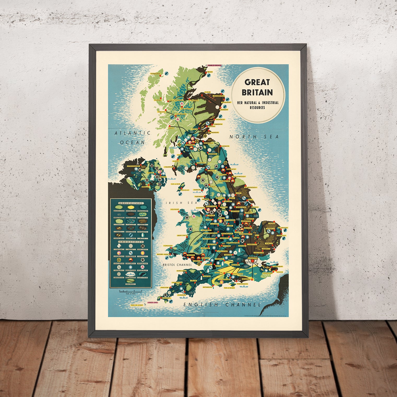Design and colour: the palette leans into deep blues and fresh greens, energized by notes of yellow to highlight coasts, fields, and key production zones. Textured patterns differentiate forests, farmland, and industrial corridors, while crisp, instantly legible icons pinpoint resource types. The result is both handsome and highly functional—an ideal conversation piece for a study, office, or living room. The simplified forms, clean coastlines, and purposeful contrasts exemplify the best of mid‑20th‑century cartographic design: informative without feeling crowded, and stylish without sacrificing accuracy.