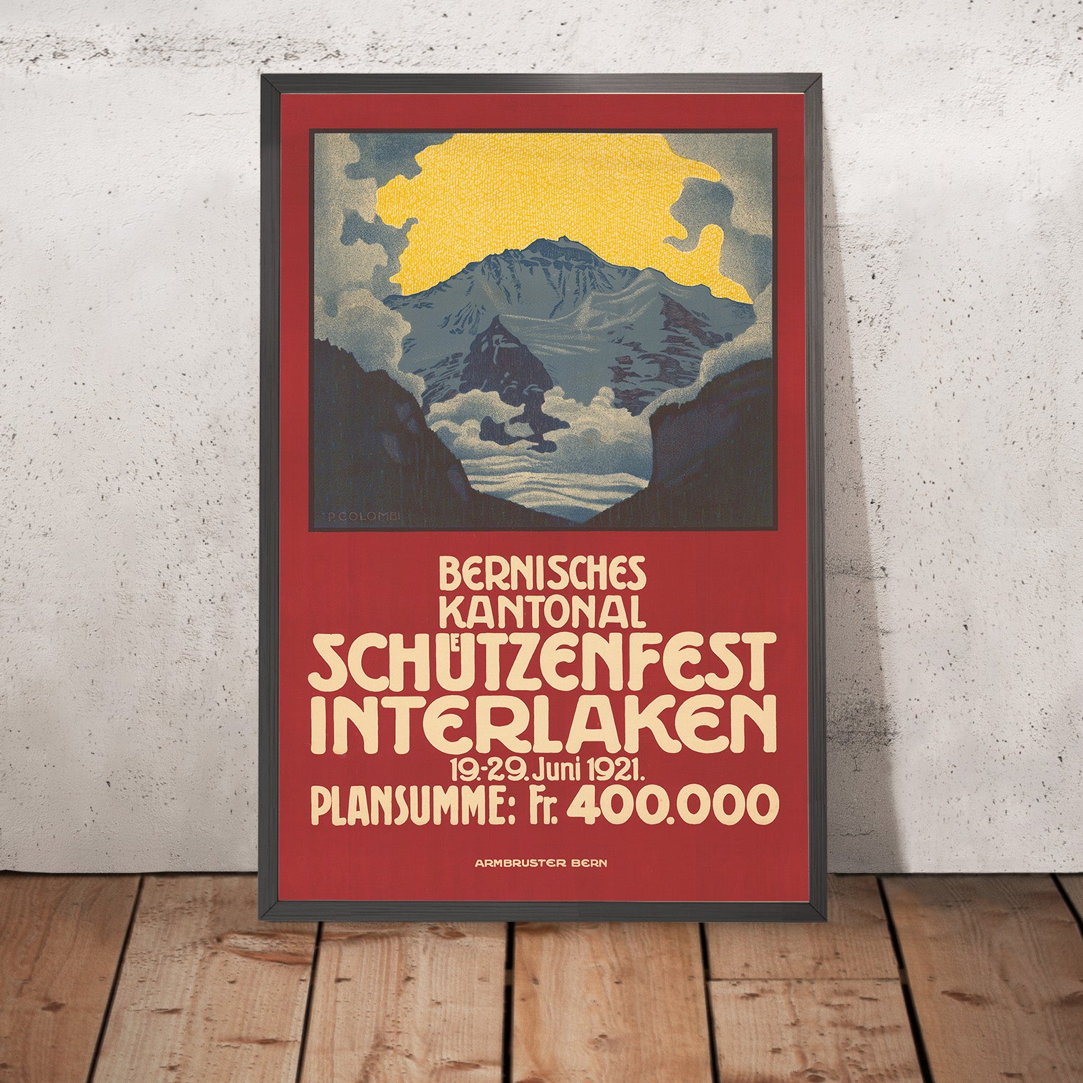 Colombi’s poster style blends clarity and drama: flattened planes, bold contrasts, and clean typography deliver an immediate read from across a room. Here, the vivid red field anchors the layout, while bright yellow elements and cool blue accents create a triadic balance that feels distinctly Swiss—sunlit, alpine, and celebratory. The palette and geometry echo the concise visual language of early 20th-century poster art, making this piece as compelling in a contemporary interior as it was on a 1920s street kiosk.