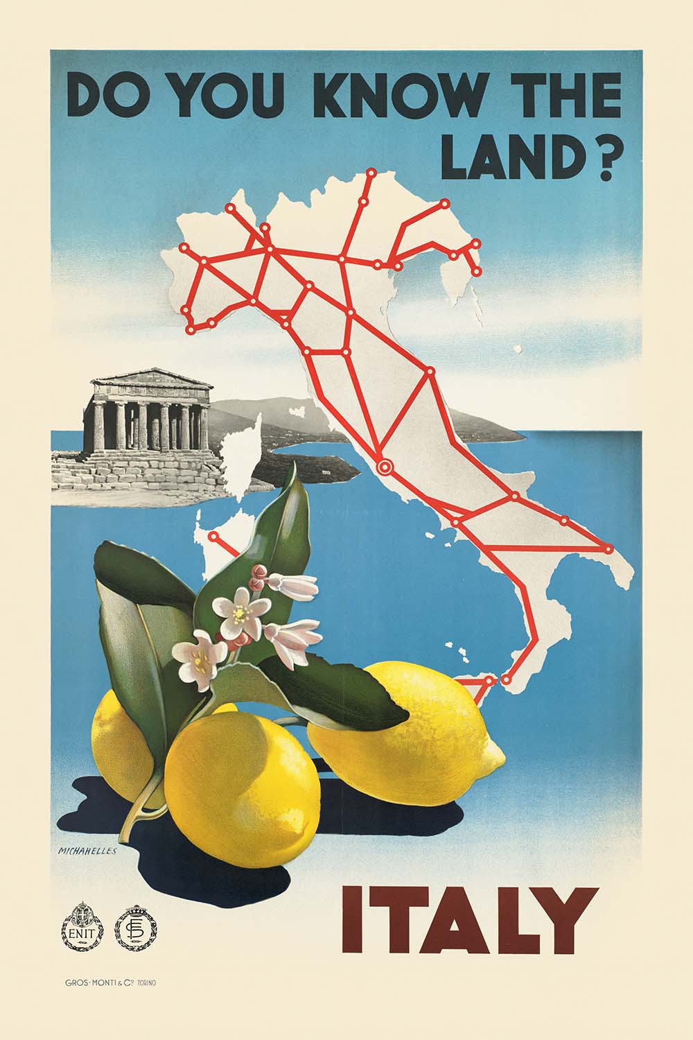 Italy. Do you know the land by Michahelles is an exquisite Art Deco travel poster from the interwar years, created to tempt travelers south with visions of sunshine, antiquity, and effortless modernity. Credited to the Italian artist Michahelles—a name closely associated with Florence’s brilliant milieu of designers and posterists—the work fuses classical heritage with the sleek optimism of the 1920s–30s. Its title knowingly echoes the celebrated poetic line about “the land where the lemons bloom,” inviting viewers to contemplate Italy’s storied coasts, temples, and cultivated groves.