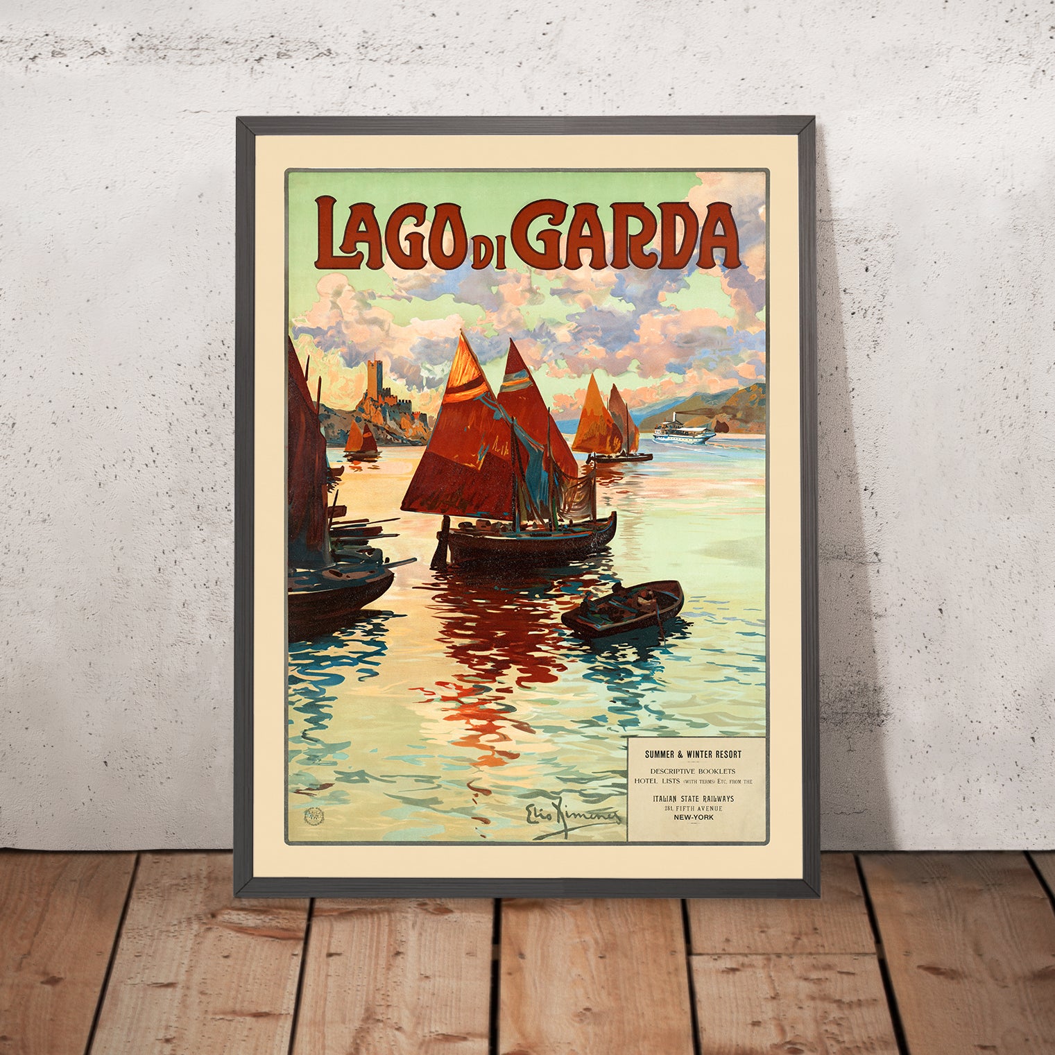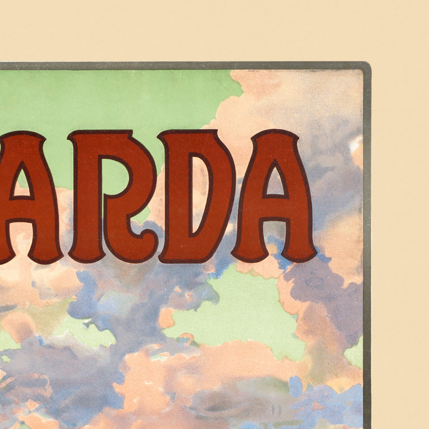Lake Garda itself is a subject of enduring fascination: a vast glacial lake set between the Alps and the Po Valley, where Mediterranean warmth meets alpine clarity. In the Belle Époque, Garda became a haven for healthful retreats and leisurely sailing—a fashionable escape celebrated in tourism posters that promised gentle breezes, citrus-scented terraces, and mirror-smooth waters. This poster distills that promise, turning a specific vista into a timeless emblem of Italian dolce vita.