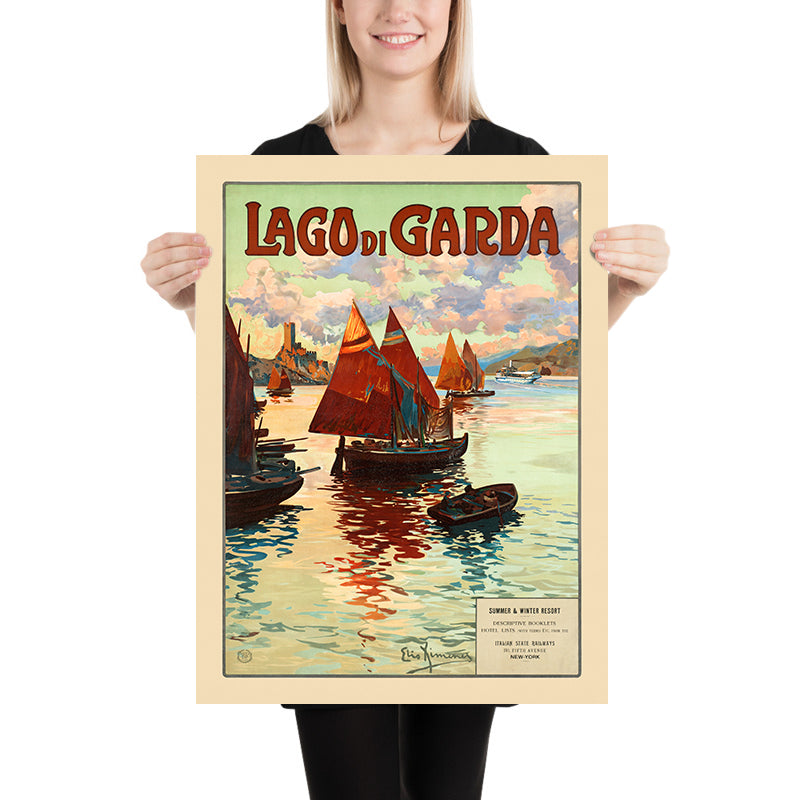 Lago di Garda by Elio Ximenes captures Italy’s largest lake at its most luminous—triangular crimson sails gliding across a blue-green expanse beneath soft, curling clouds. Created in the golden age of European leisure travel, this antique travel poster channels the romance of the Belle Époque, inviting the viewer to remember sunlit crossings between storybook towns like Sirmione, Riva del Garda, and Malcesine. Even without a documented year of issue, its Art Nouveau sensibility places it firmly in the era when elegant posters were the most persuasive ambassadors of place.