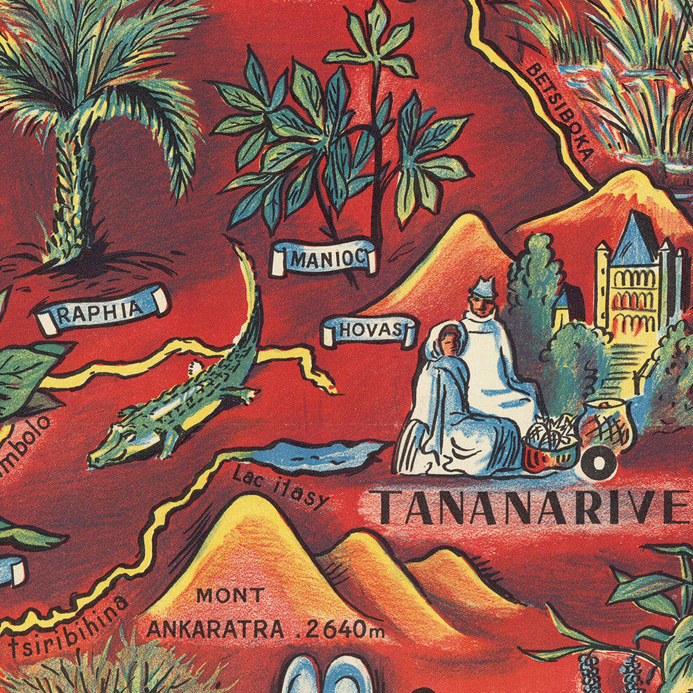 Why this subject matters: Madagascar occupies a singular place in the imagination—remote yet inviting, culturally rich, and ecologically extraordinary. In the early 1950s, as global air travel expanded and tourism flourished, such posters helped define how destinations were envisioned abroad. This composition doubles as a cultural snapshot: traditional Malagasy figures, motifs, and fauna animate the island’s silhouette, fusing pride of place with a welcoming spirit that spoke directly to the travelers of its time.