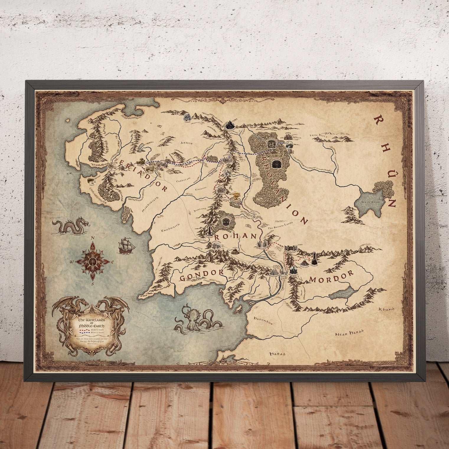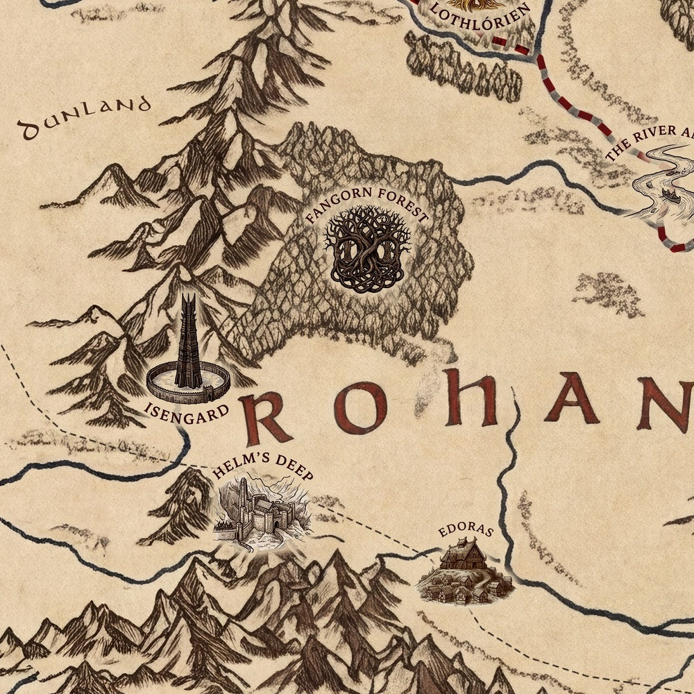 Geography becomes character here. Eriador unfurls westward into the familiar fields of the Shire, with Hobbiton nestled like a bright seed of home. The Misty Mountains rear as a crenellated barrier, their passes intimating peril for travelers bound east. The Anduin—the Great River—threads southward as the composition’s liquid spine, guiding the gaze toward the horse-lords of Rohan and the stone-lored fastnesses of Gondor. Beyond, Mordor darkens the horizon, announced by its stark relief and the map’s expressive gestural hand. Rhovanion, stretching broad and storied, balances the tableau, reminding the viewer that Middle-earth’s drama is as much about distances and divides as it is about heroes.