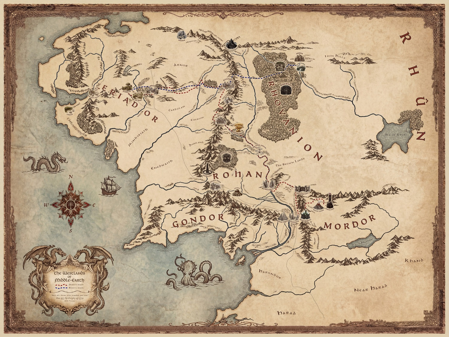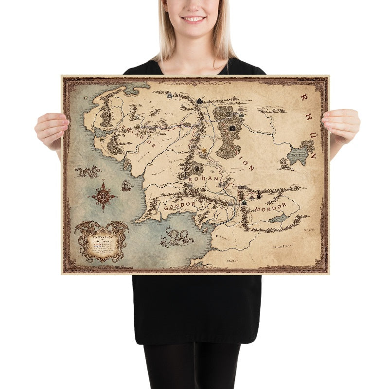 Every embellishment rewards slow looking. The elegant cartouche frames the title like a proclamation; compass emblems and delicate rhumb-like accents lend navigational theater; and the playful sea beasts whisper of the unknown edges beyond charted lands. Hand-drawn illustrations of the Shire, Rohan, Gondor, and Mordor carry emotive weight, each rendered to echo its narrative temperament—pastoral, martial, noble, and foreboding. The whimsical treatment of forests, rivers, and ranges elevates the map from reference to reliquary, transforming canonical journeys into a choreography of lines and emblems. The Elvish script that adorns the ornate frame.