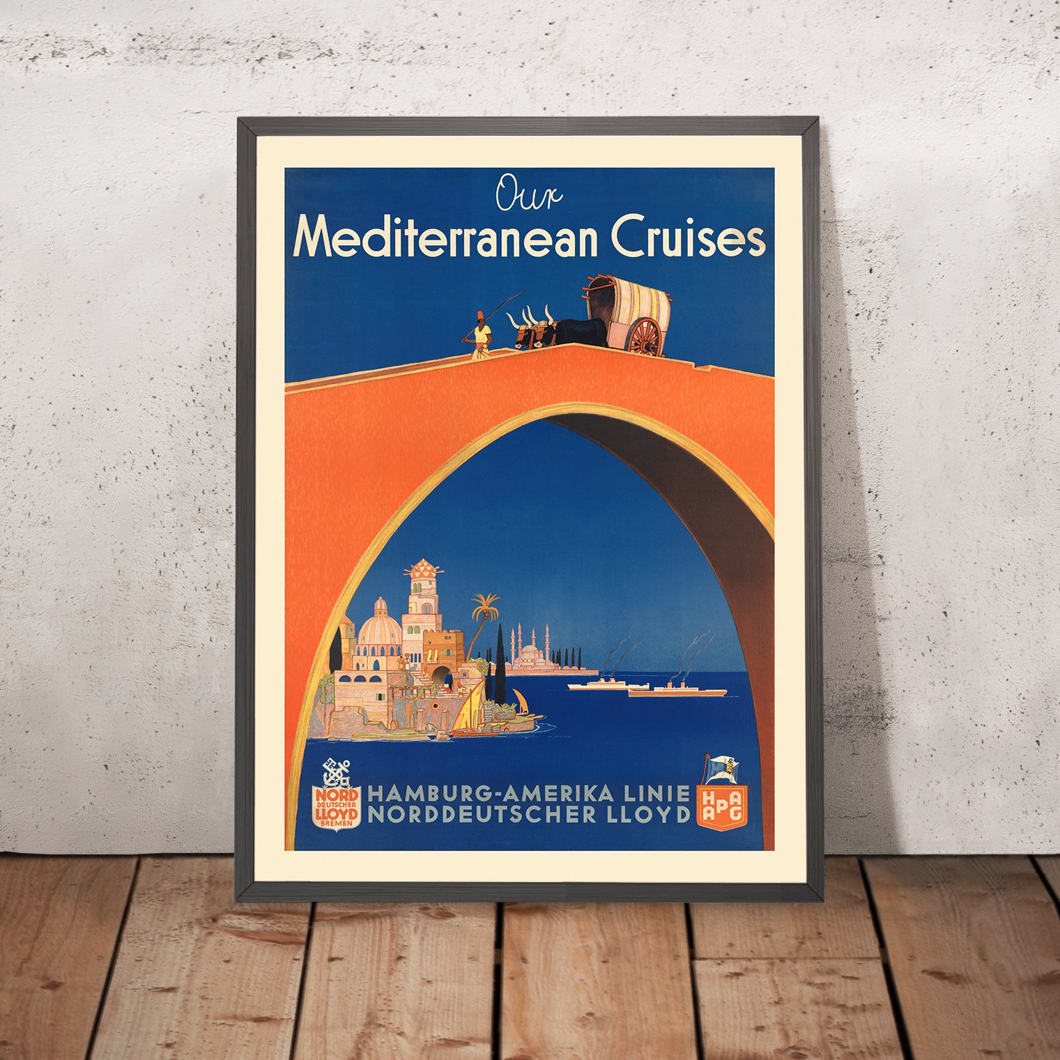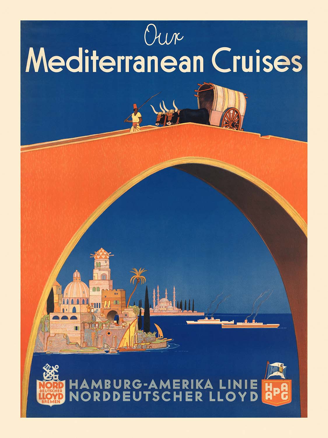 The subject is a love letter to the Mediterranean itself. Under a great arch—an intentional nod to the region’s blend of classical and Moorish influences—stylized buildings glow in sun-baked oranges and yellows, while deep blue sea and sky suggest cool breezes and open water. In the foreground, a whimsical ox-drawn cart evokes age-old rhythms of port life, juxtaposed with gleaming steamers just offshore. That dialogue between old and new is the magic of this poster: timeless landscapes welcoming a modern world of cruising.