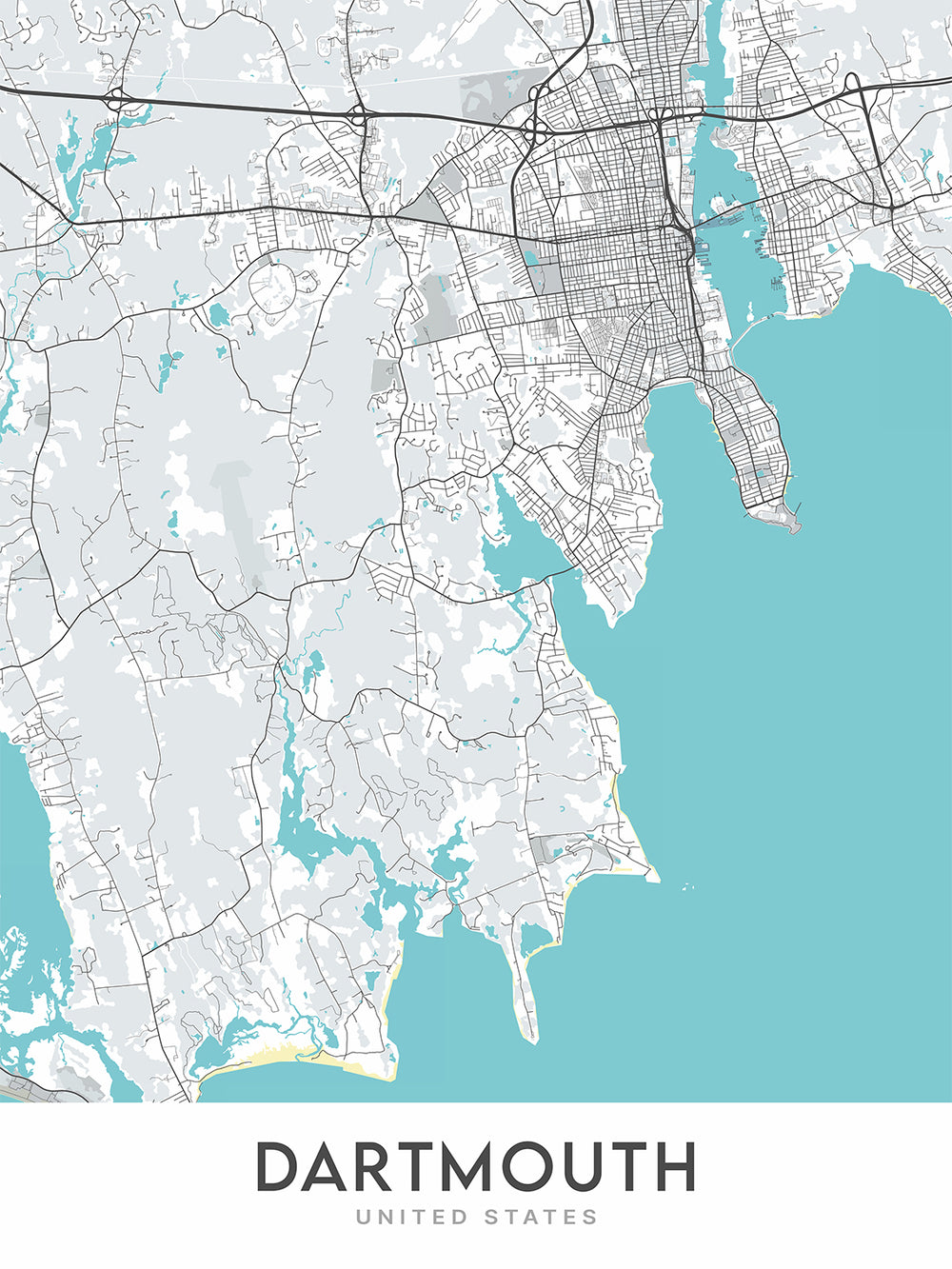 Este mapa de Dartmouth en Massachusetts es un callejero moderno y detallado sin etiquetas, perfecto para añadir un toque de estilo contemporáneo a la decoración de su hogar. El mapa cubre un área grande, que se extiende aproximadamente 9 millas al norte y al sur del centro de la ciudad, y 7,5 millas al este y al oeste. Esto garantiza que se incluyan todos los barrios, puntos de referencia y vías principales, lo que la convierte en una opción ideal para cualquiera que busque explorar o recordar esta vibrante ciudad.