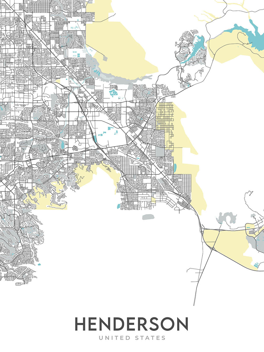 Este mapa de Henderson, Nevada, es un mapa de calles moderno y detallado, que se centra en los vecindarios de la ciudad, las carreteras principales y los hitos. El mapa cubre un área rectangular que mide aproximadamente 16 millas de alto por 13.4 millas de ancho, con la ciudad de Henderson en su centro. El mapa está diseñado para ser tanto informativo como visualmente atractivo, lo que lo convierte en una gran adición a cualquier hogar u oficina.
