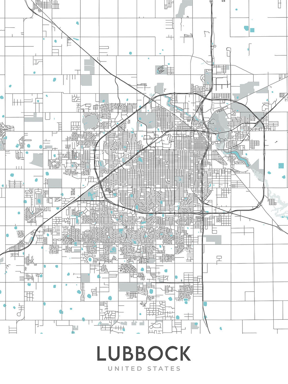 Este mapa de Lubbock, Texas, es un callejero moderno y detallado sin etiquetas, que se centra en el paisaje urbano único de la ciudad. El mapa cubre un área sustancial de Lubbock, incluida una variedad de vecindarios, carreteras principales y puntos de referencia.