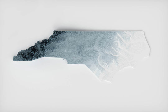 Da vida a Carolina del Norte con un mapa que se siente tan dinámico como el paisaje mismo. El estado se extiende desde los escarpados picos y profundos valles de las Montañas Apalaches en el oeste, donde las crestas empinadas y las altas cumbres atrapan la luz y proyectan sombras dramáticas, hasta el amplio y ondulado Piedmont en el corazón del estado. Aquí, verás suaves ondulaciones, resaltadas por un juego de luz que destaca las sutiles colinas y los valles de ríos que serpentean a través de la región.