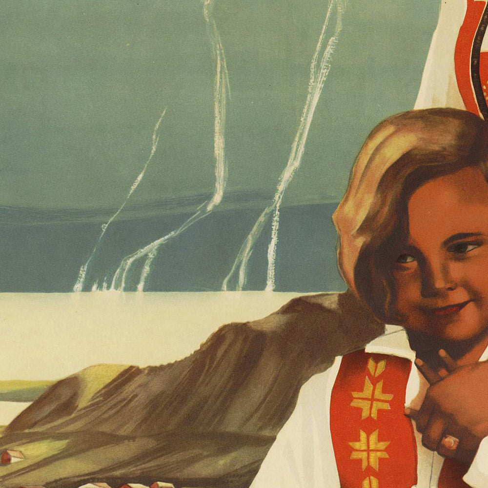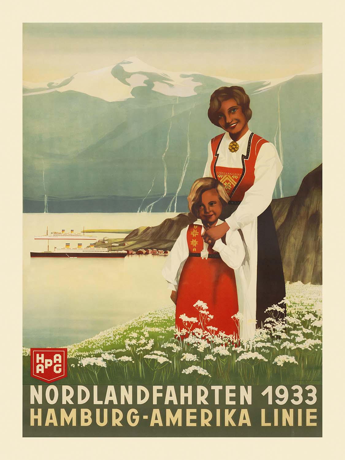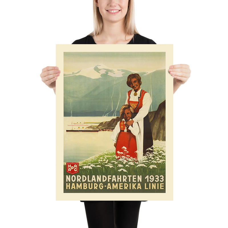 Nordlandfahrten 1933, Hamburg-Amerika Linie is a luminous example of interwar Art Deco travel advertising, created in 1933 to promote “Northland” voyages into the dramatic landscapes of Northern Europe. Although the individual poster artist is lost to history, the design speaks fluently in the era’s visual language: a mother and child in traditional Nordic dress gaze over an alpine-blue fjord, angular mountains rising behind them while ocean liners slip into view. The image evokes warmth, safety, and cultural pride—exactly the feelings that cruise lines of the early 20th century hoped to kindle in would-be travelers.