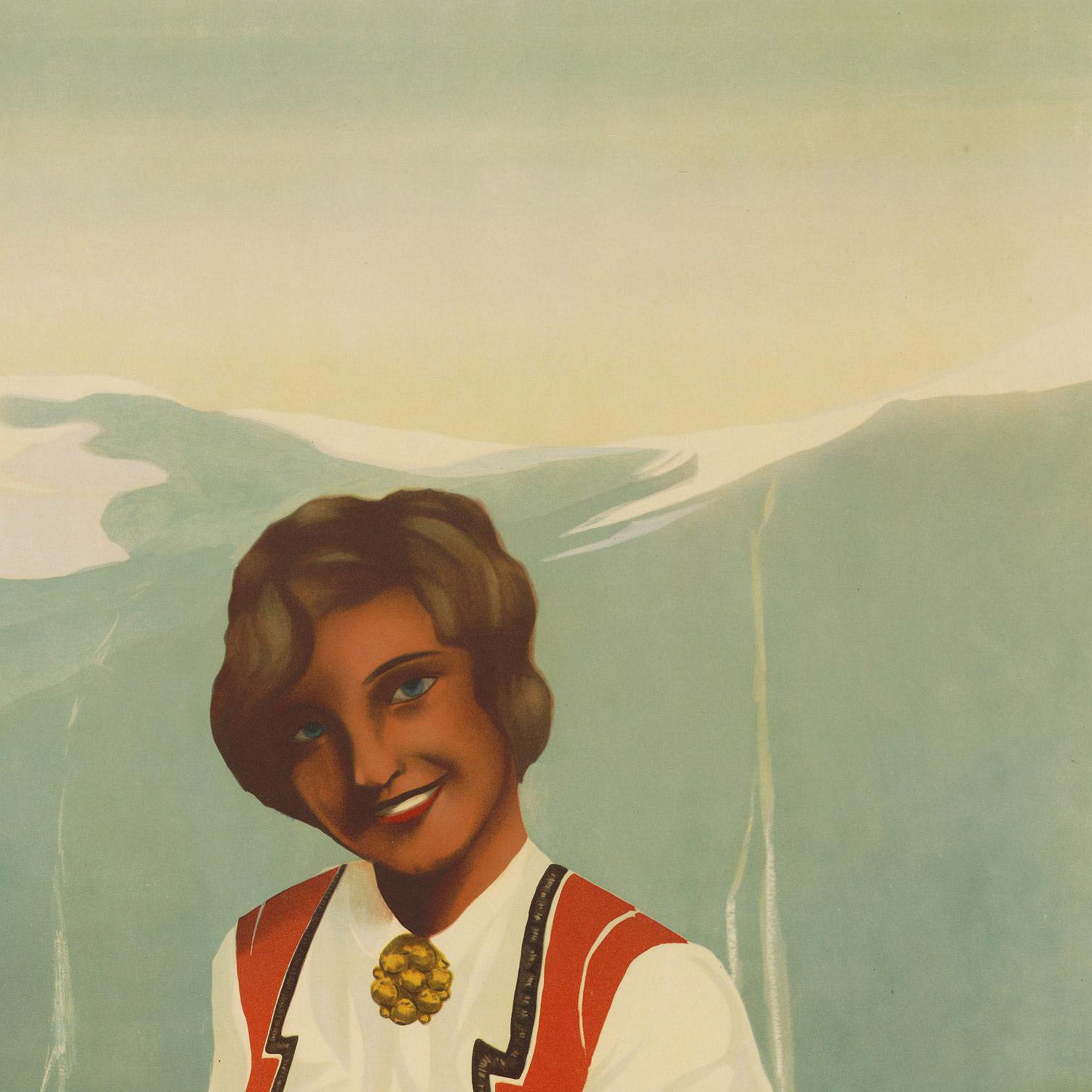 Color plays a starring role. The dominant green of hillsides and meadow, crisp whites in garments and lettering, and carefully placed reds in the traditional costume create a vivid triad against cool blue water and sky. Smooth, blended strokes give the figures an inviting softness, while the background mountains are more angular and stylized—a classic Art Deco contrast between human warmth and the grandeur of nature. The flowers in the foreground soften the scene further, while the ship silhouettes anchor the narrative of elegant passage from city to fjord.
