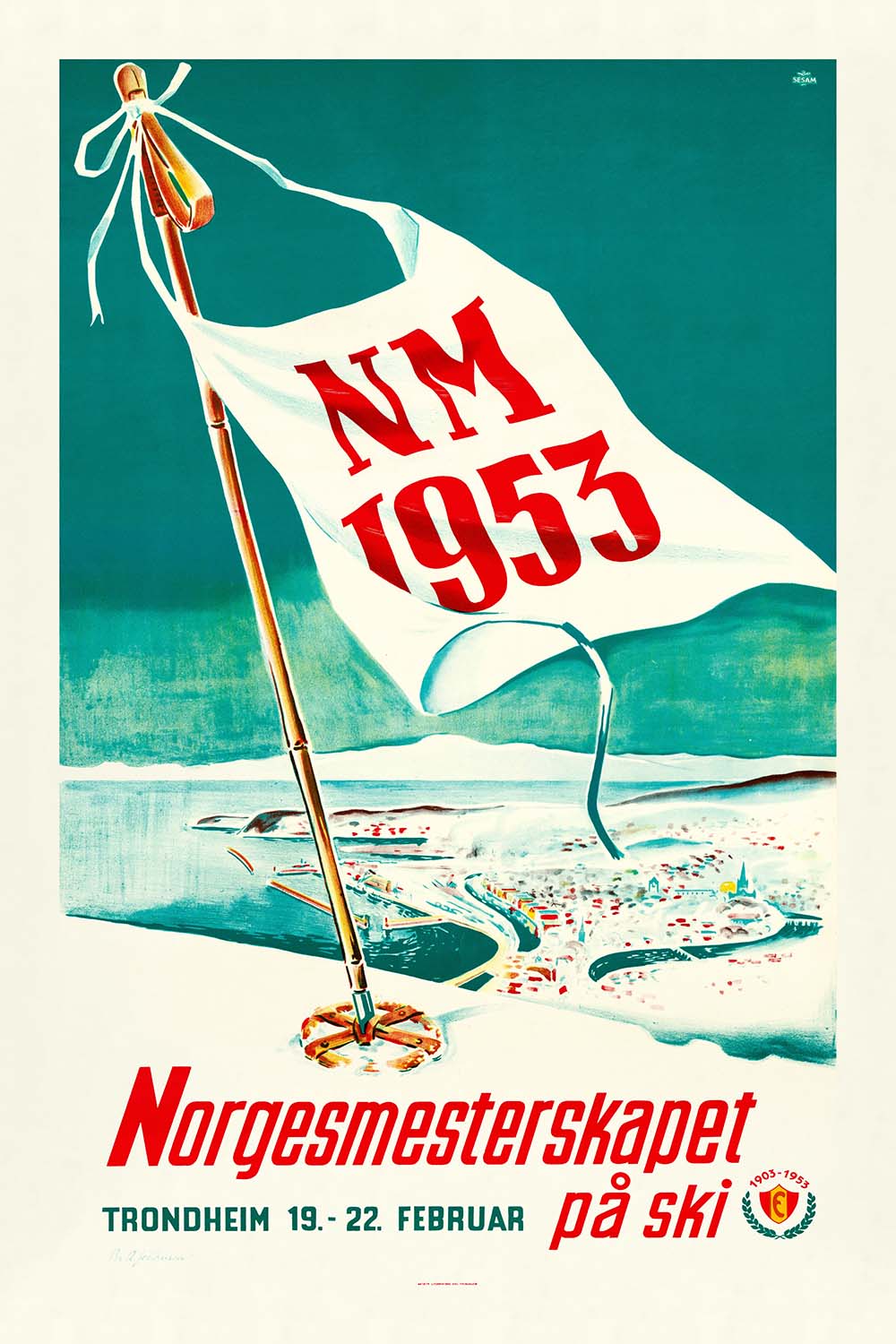 Norgesmesterskapet på ski (1953) by Per A. Johansen Sted captures the energy and optimism of post-war Norway through a striking, minimalist composition. Likely produced to promote the Norwegian National Ski Championships, the design embodies mid-century modern graphic sensibilities: bold, legible typography and a clean, pared-back layout that communicates swiftly and with style. With “Norgesmesterskapet” and “NM 1953” set against a cool green-turquoise field, a sweeping white pennant and a diagonally placed pole convey motion, alpine air, and the spirited pageantry of winter sport.