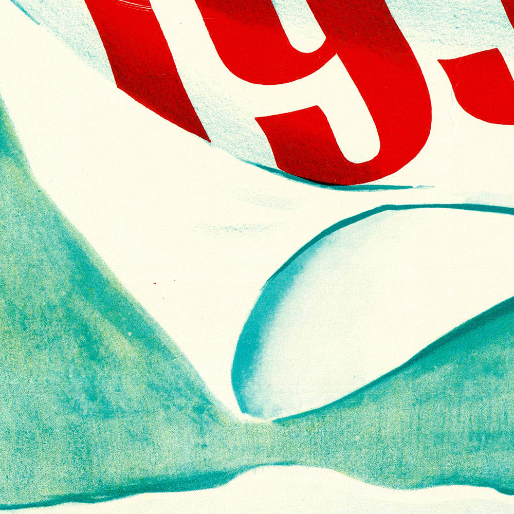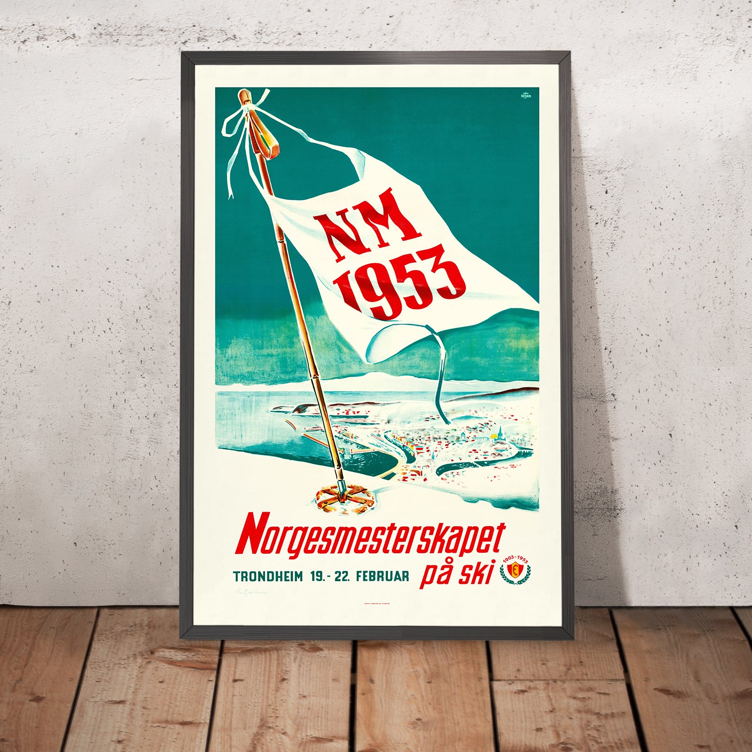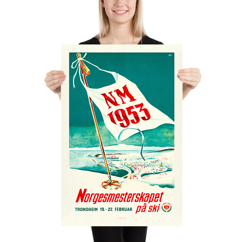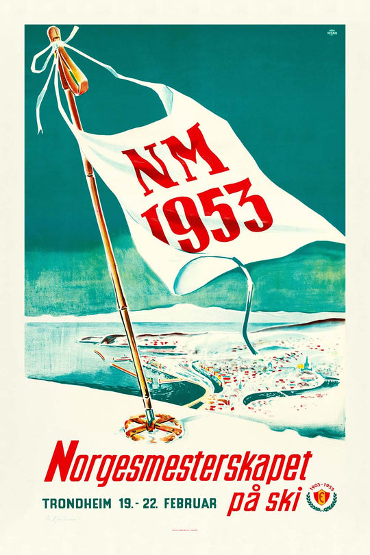 Design and color: The dominant green-turquoise background has a refreshing, high-altitude clarity that feels contemporary even today. White is used decisively in the flag to add brightness and movement, while confident red lettering (“NM 1953,” “Norgesmesterskapet”) anchors the message and heightens visibility. The diagonal pole and flowing pennant inject dynamism without clutter, exemplifying how mid-century designers distilled motion into a few essential shapes. As décor, this piece pairs beautifully with Scandinavian interiors, mid-century furniture, and modern rustic spaces—equally at home in a ski lodge, a hallway gallery wall, or a study that leans Nordic.