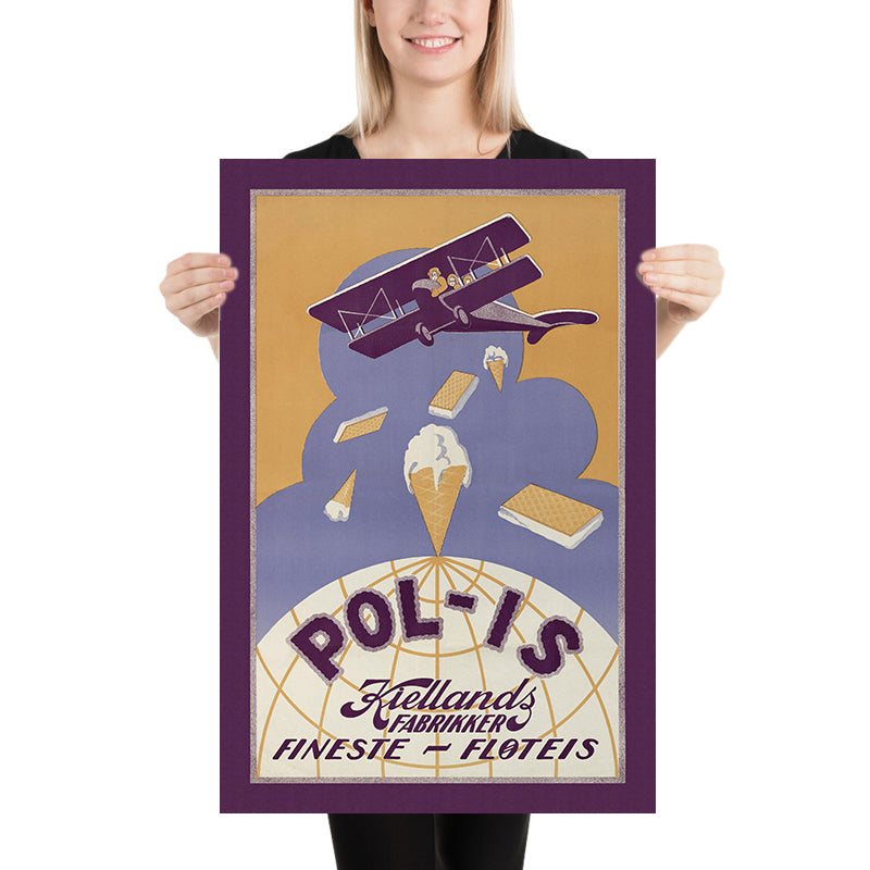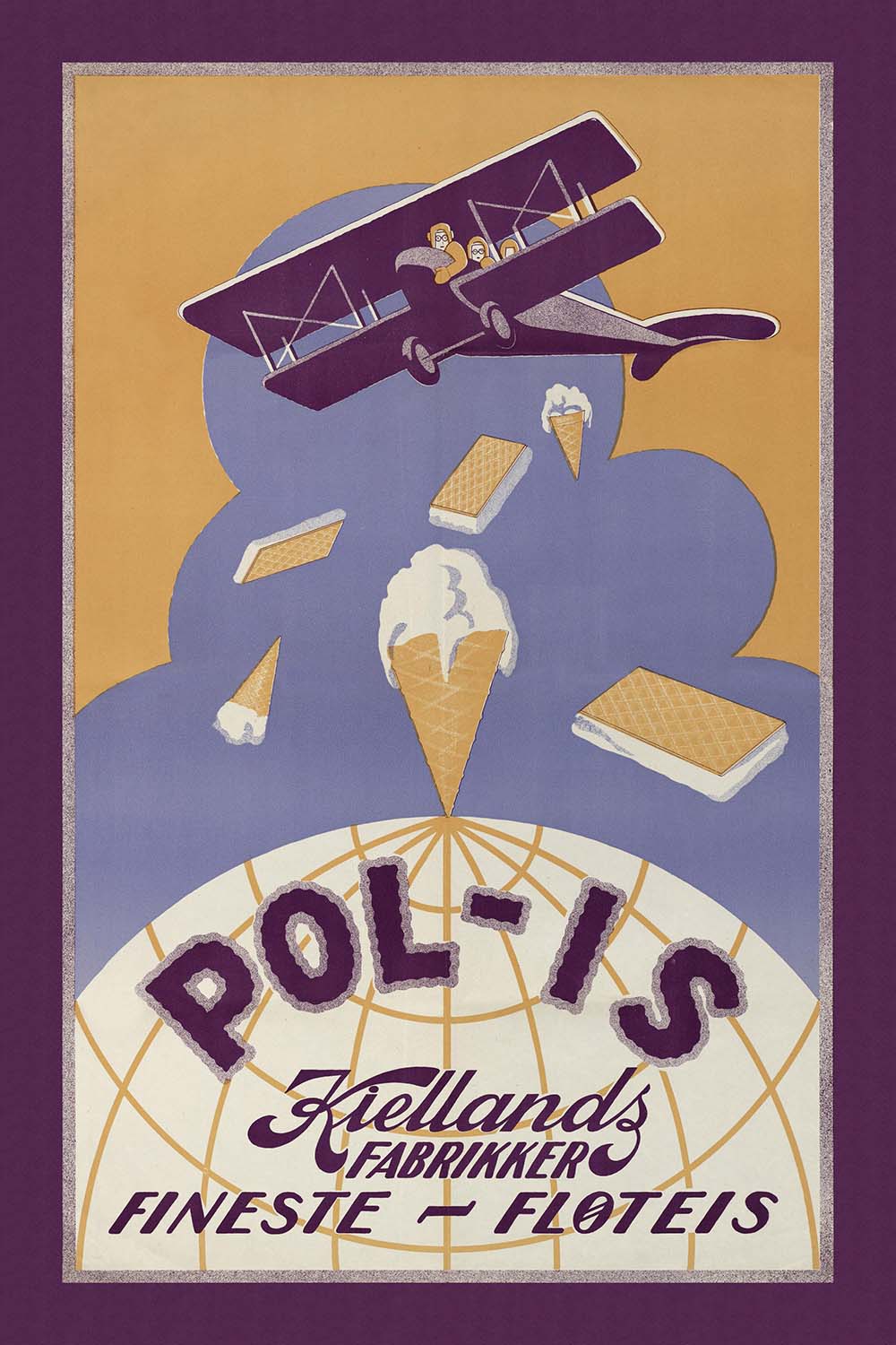 Why it matters: This poster channels the interwar fascination with speed and distance—an airplane slicing across a globe—while anchoring the scene in everyday pleasure: “Pol‑is” ice cream. The playful brand name nods to “polar” cool, a clever fit for Norway’s northern identity, and to the era’s embrace of refrigeration and café culture. Travel and taste fuse into a single promise of modern living, making the design especially resonant for anyone who has explored Norway or cherishes Nordic style.