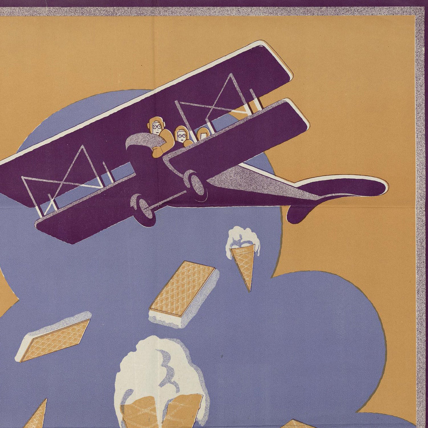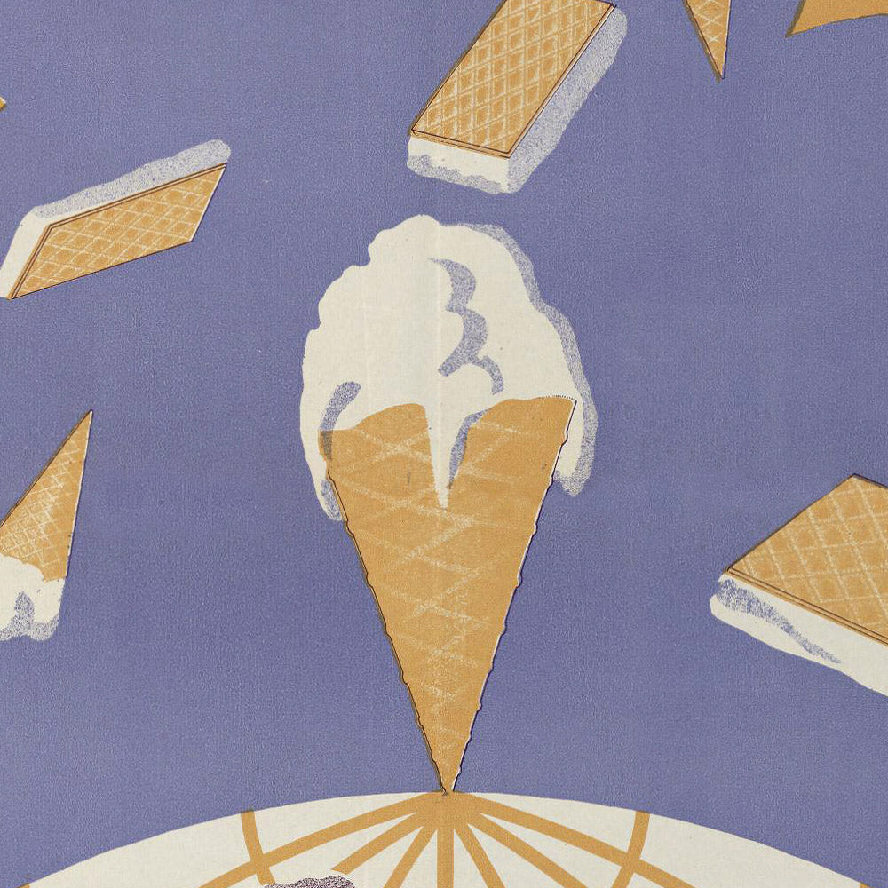 Pol-is ; fineste – fløteis is a striking Art Deco–era poster by an anonymous Scandinavian commercial artist, celebrating the joy of ice cream with the glamour of modern travel. With its Norwegian wording (“fløteis” meaning rich cream ice cream) and aviation motif, the design evokes interwar optimism—when flight, refrigeration, and sleek styling promised a brighter, more connected world. A streamlined airplane arcs over a gridded globe while jubilant scoops rise like suns, turning a simple treat into a passport to delight.
